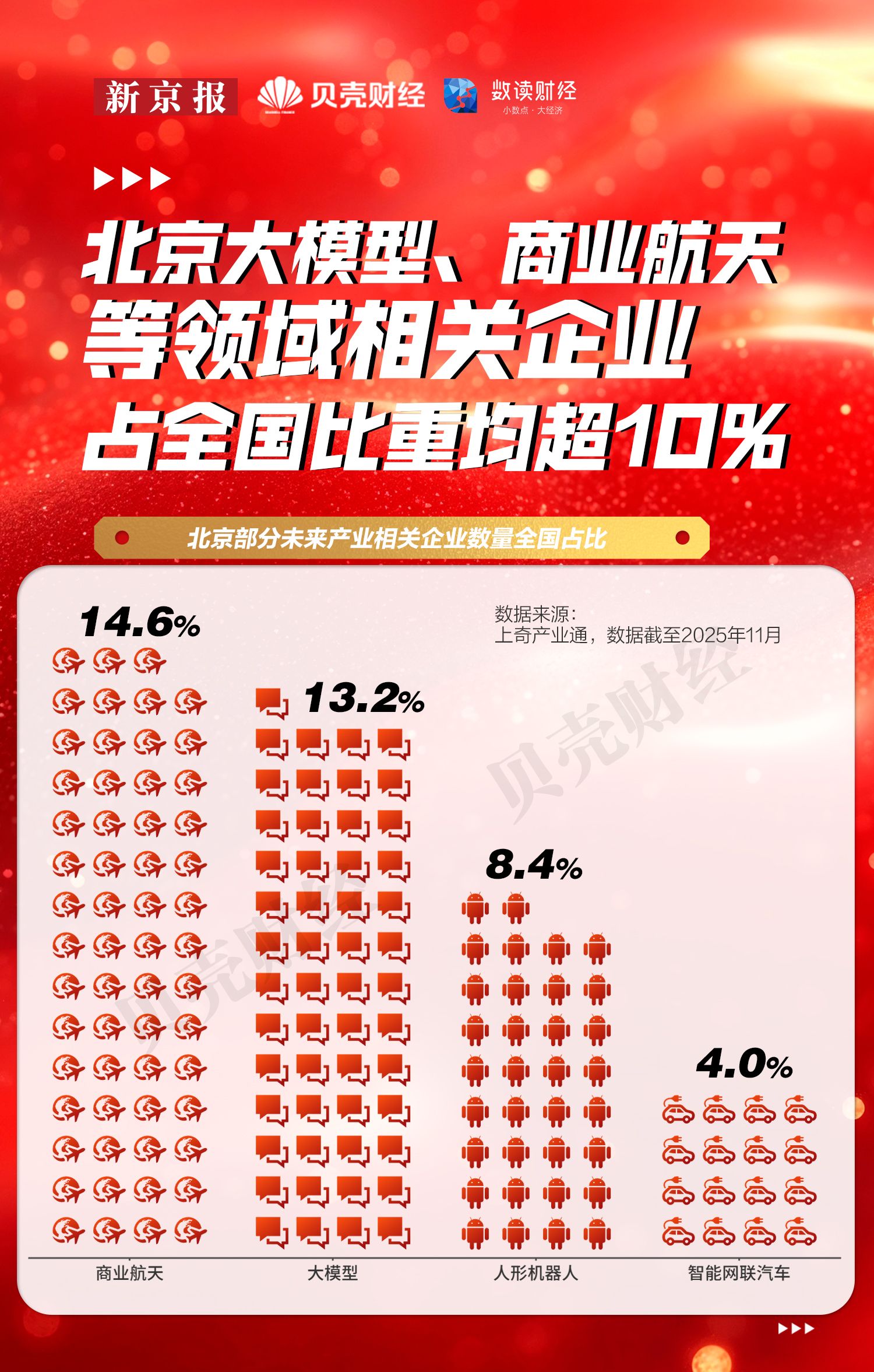 作为新质生产力的重要组成部分,未来产业的发展显著拉动经济增长。贝壳财经记者梳理数据发现,北京在人工智能、低空经济、自动驾驶(下一代汽车)及机器人(人形机器人)产业方面优势显著。其中,北京在大模型、商业航天等领域相关企业占全国比重均超10%。