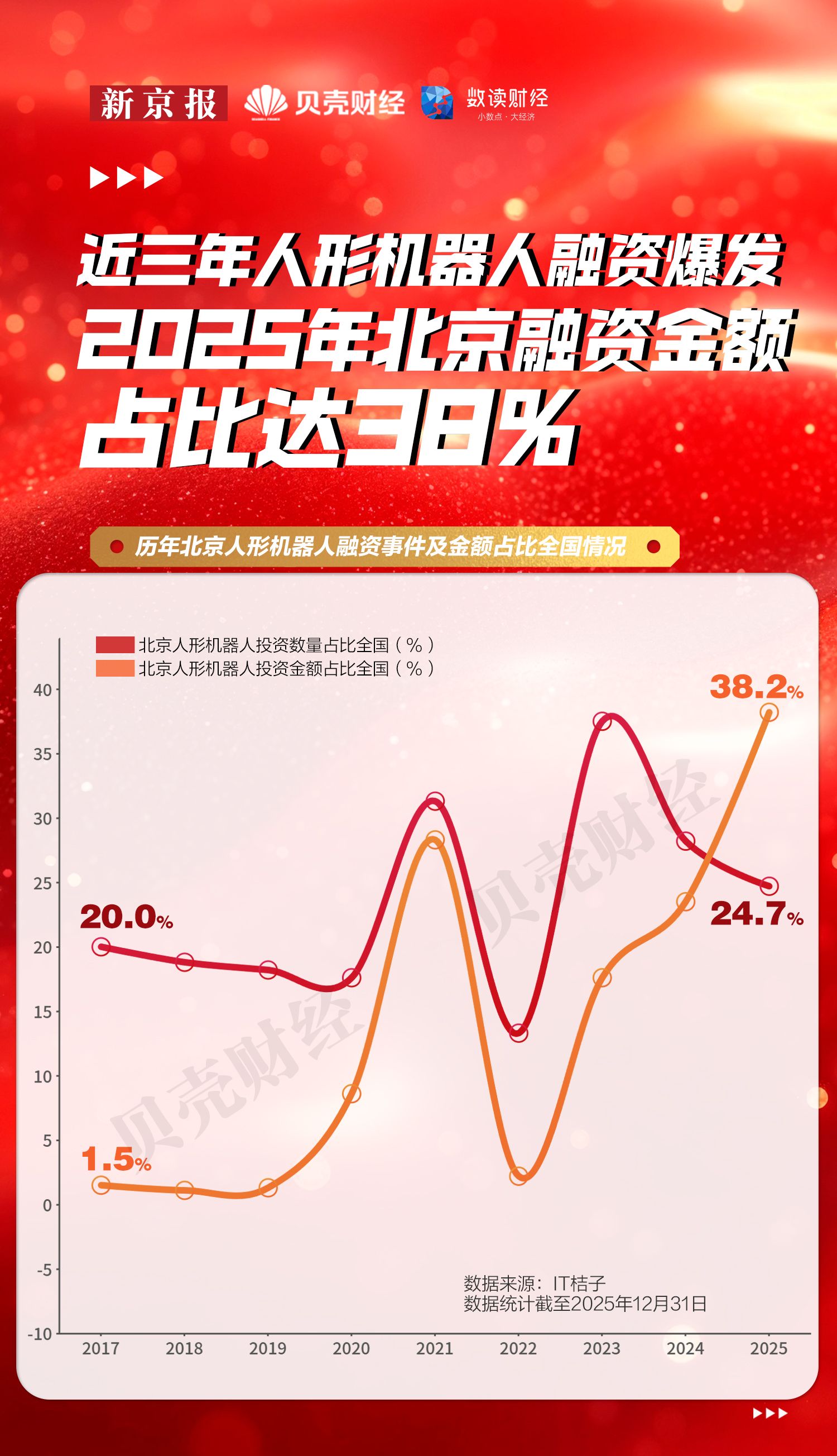 截至2025年12月31日,北京人形机器人境内相关融资事件48起,融资金额104.7亿元,占全国比重约38.2%。目前,北京集聚30家人形机器人整机单位,拥有机器人专精特新“小巨人”企业57家。