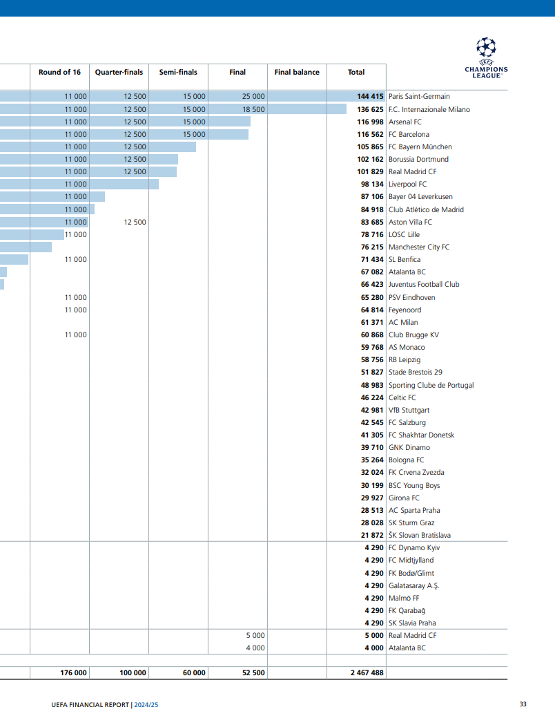 欧冠联赛方面,冠军巴黎圣日耳曼以约1.444亿欧元的总奖金居首,位列第二的是亚军国际米兰(约1.366亿),其余总奖金超过1亿的俱乐部分别是是阿森纳(1.17亿)、巴塞罗那(1.166亿)、拜仁慕尼黑(1.059亿)、多特蒙德(1.022亿)、皇家马德里(1.019亿)。