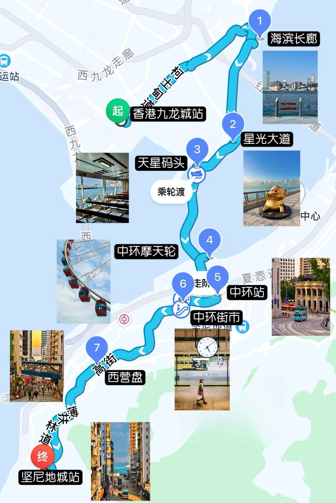 西九龙-尖沙咀海滨长廊-星光大道-尖沙咀钟楼-尖沙咀码头乘坐天星小轮-中环摩天轮-中环站(终审法院)-中环街市-西营盘-坚尼地城