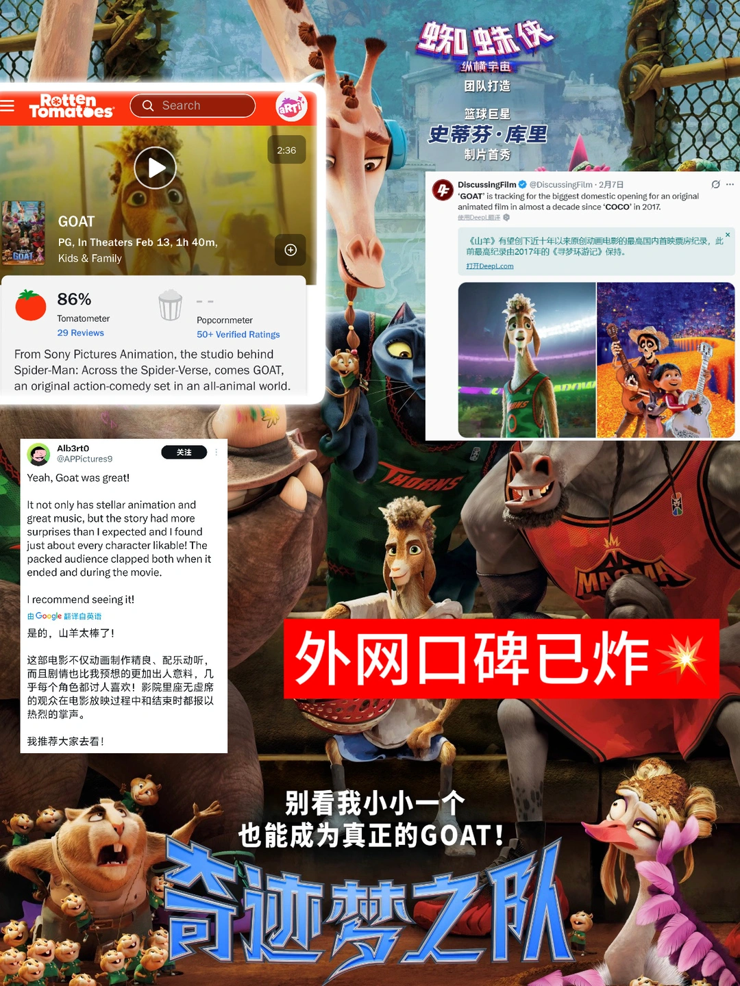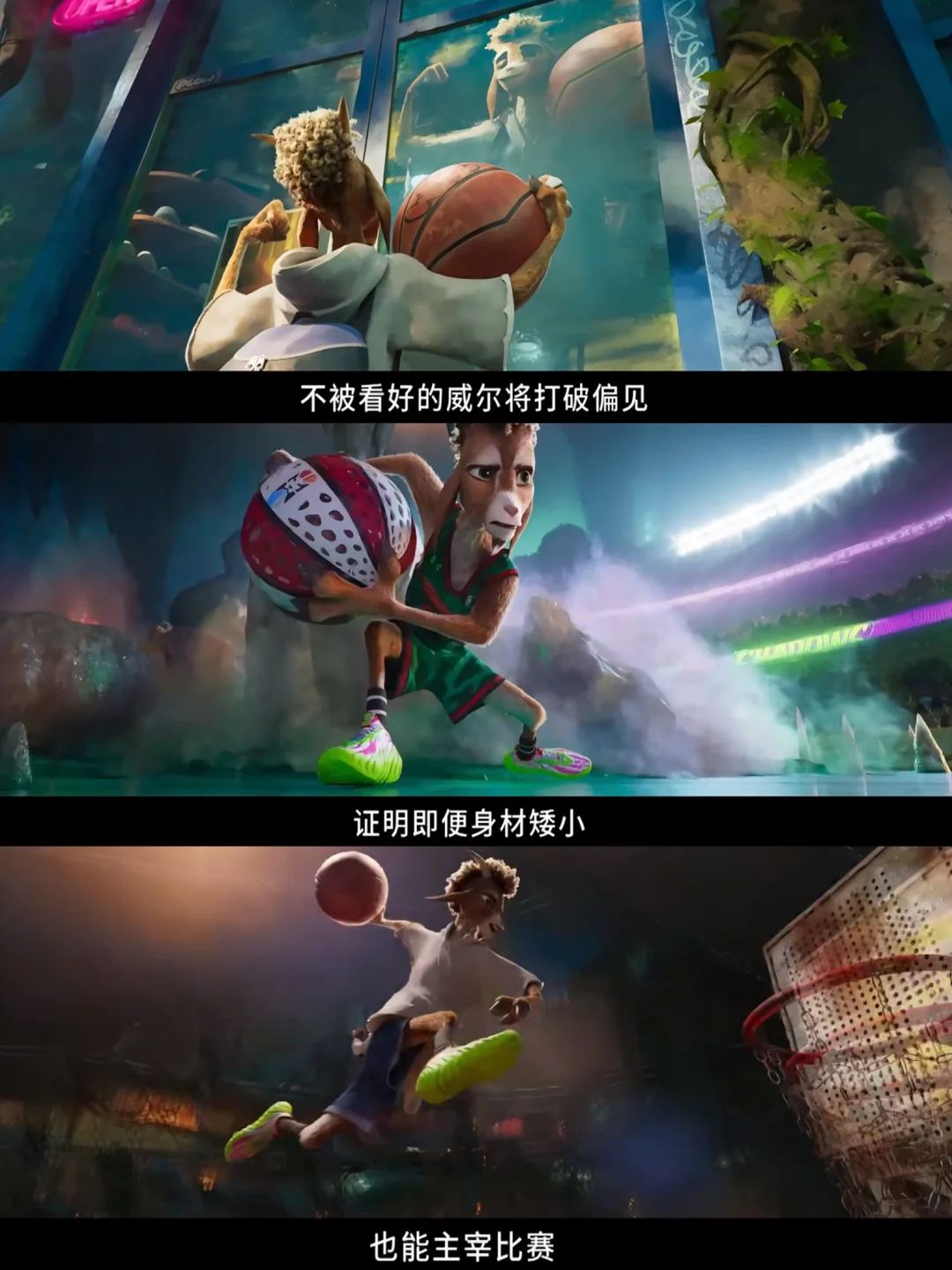 主角山羊威尔设定太妙了——身材不占优势,却拥有弹跳力MAX和超远三分能力,从网络爆红到进入梦中情队,却发现现实比想象更残酷:队友难带、对手挑衅、赛季垫底。那种在猛兽林立的赛场上拼命抢回位置的感觉,看预告已经开始起鸡皮疙瘩了。英文版片名也很巧妙,GOAT既是主角威尔的身份,又是球场上最佳的缩写,已经开始让人好奇主角是如何由山羊GOAT成为了最佳GOAT!