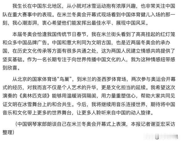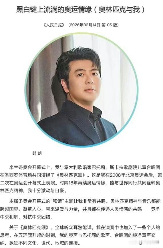 【郎朗人民日报撰文谈奥运情缘 】 2月14日,郎朗在《人民日报》撰文《黑白键上流淌的奥运情缘》,他说:“米兰冬奥会开幕式上,我与意大利歌唱家巴托莉、斯卡拉歌剧院儿童合唱团在圣西罗体育场共同演绎了《奥林匹克颂》。这是我在2008年北京奥运会后,第二次在奥运会开幕式上表演。时隔18年再续奥运情缘,能与世界同行共同诠释奥林匹克精神,我十分激动与自豪。”