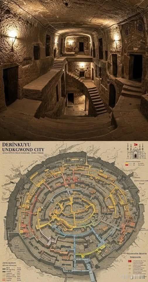 德林库尤地下城(Derinkuyu Underground City)位于土耳其卡帕多奇亚地区,是该地区已知最深且规模最大的地下城市遗址。它不仅是一项令人惊叹的古代工程奇迹,也是早期基督教徒躲避宗教迫害和外敌入侵的重要避难所。 规模与深度:地下城深入地底约 85米(约279英尺),结构复杂,共有约 18层。 容纳人数:据估算,这里曾可供约 20,000人 及其牲畜和粮食长期居住。 建造背景:最初可能由弗里吉亚人于公元前8-7世纪开始开凿,后由拜占庭时期的基督徒大规模扩建。 重新发现:该遗址于1963年因一名当地居民装修房屋时偶然打通墙壁而重见天日。 内部构造与设施 地下城宛如一个自给自足的“地底大都市”,内部设施一应俱全: 生活区:包含居室、厨房、储藏室、马廄和地窖。 公共设施:设有教堂、修道院,以及德林库尤特有的带桶形穹顶的宗教学校。 防御系统:每层通道都装有巨大的圆轮形石门,只能从内部开启,可有效阻挡入侵者。 生存支持:拥有超过50个通风井直通地面,确保深层空气流通,并建有深达地下的水井系统。 旅游信息 地址:土耳其内夫谢希尔省(Nevşehir)德林库尤镇。 开放情况:目前约有 8层 向公众开放。 游览建议:由于内部通道狭窄且呈迷宫状,建议聘请导游。 周边联动:德林库尤常与凯马克勒地下城通过长达数公里的地下隧道相连,是卡帕多奇亚“绿线”旅游路线的核心景点。