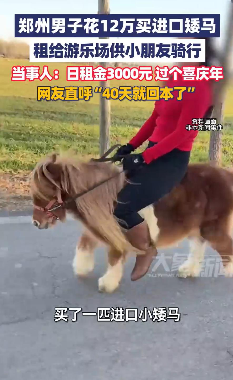 万万没想到!河南郑州,男子以前花12万买了一匹进口矮马,当时身边的家人朋友都不理解,可男子就是喜欢,而随着马年到来,男子这匹小矮马一下就火了,租给游乐场一天就能赚3000块,这下给不少人都看眼红了 要说今年啥最火,那肯定是跟马沾边的东西,而王先生阴差阳错的就赶上了这个风口,当初他花了12万,从国外捣腾回来一匹小矮马。家里人当时那脸色,估计比那马脸还长,街坊邻居知道了,背地里指不定咋嘀咕呢,不理解花这么多钱买个这玩意儿,能吃还是能喝?养这么大一宠物,图个啥? 可他就是轴,是真喜欢,甭管别人咋说,就当个宝贝疙瘩伺候着,这几年下来,估计也就当个稀罕物件自个儿乐呵 谁成想,风水轮流转,今年到马家。这匹可爱的小矮马,一下子就成了香饽饽。用网上流行的话说,那叫一个出道即巅峰 有家游乐场,眼瞅着过年了,都想搞点新鲜玩意儿吸引小朋友。这马年,让孩子们骑骑真马,多应景,多喜庆。可大马吧,有点吓人,小朋友未必敢上。这时候,这匹性格温顺、模样呆萌的小矮马,简直就是天选之子 游乐场的人辗转找到这位男子,开口就要租他的马。一开始男子也犹豫,毕竟养了这么久,跟自家孩子似的,过年团圆的日子,送出去上班,心里头不是滋味。可当对方报完价,男子当场就有点懵了。一天,就一天,给3000块 虽然也舍不得,但奈何对方给的实在太多,最后还是选择租出去。只是苦了这匹小马,过年这段时间的运动量估计要比之前加起来都要多了 这事儿看着挺逗,其实也挺有意思。它不光是说这人运气好,更多是说明了稀缺性的价值。满大街都是的东西,再便宜也没人稀罕;但像这种温顺的进口矮马,整个城市可能都找不出几匹,到了特定的时间点,它就拥有了定价权 所以,说不定下次看到某个让人不解的爱好,大家不妨想想,或许它背后蕴藏着不为人知的商机。把兴趣和实践结合,谁知道它会带来什么样的意外惊喜呢?