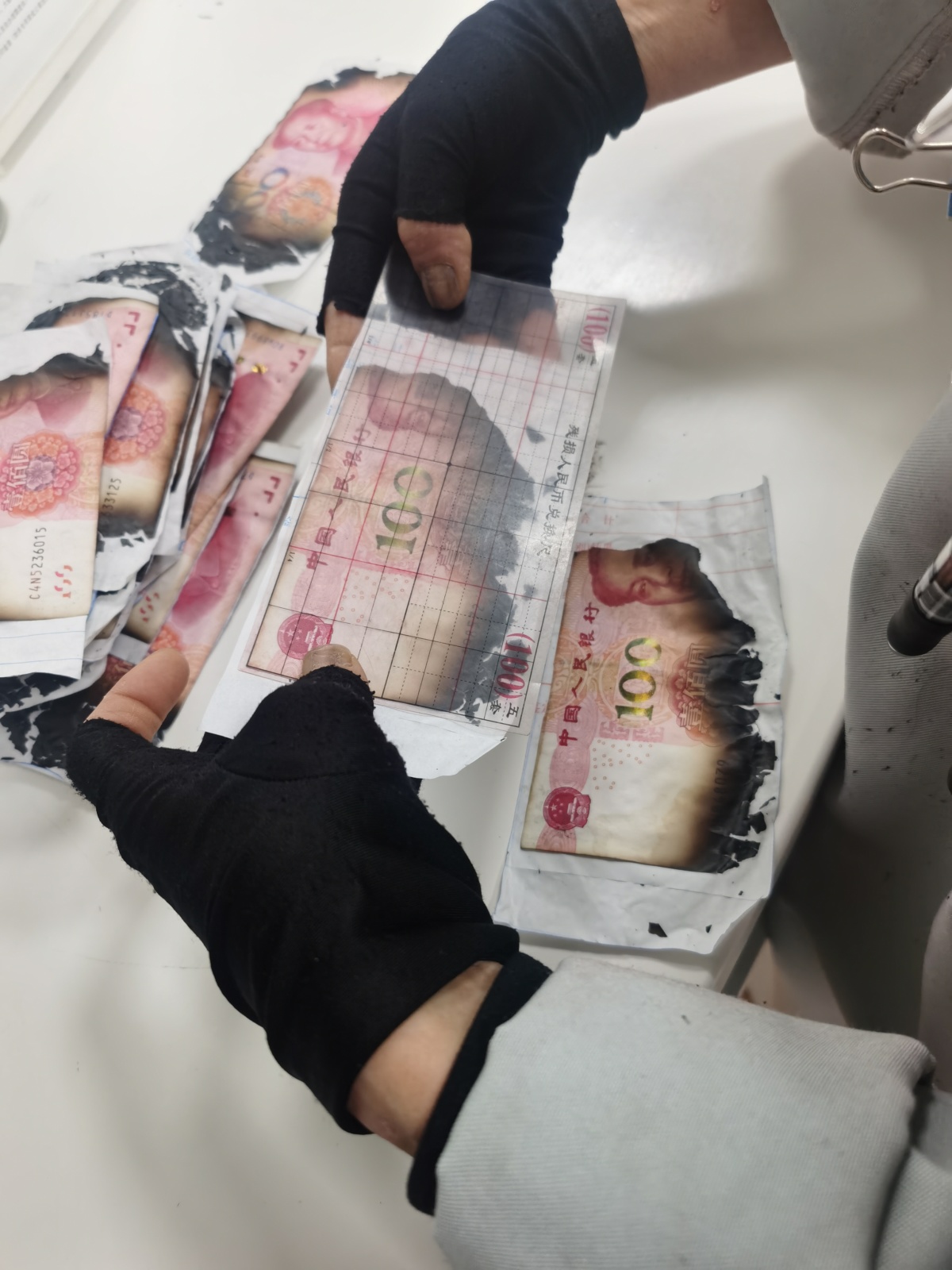 兑换现场,工作人员佩戴手套,手持镊子、放大镜、残币量尺等专业工具,小心翼翼地将碳化纸币逐一分离、摊平、拼接。每张残币都对照《残缺污损人民币兑换办法》,结合剩余面积、图案清晰度综合判定兑换比例。经办人员介绍,为避免误差,全程实行双人交叉复核,从分类整理到鉴伪核定,从数据核对到新钞兑付,每一步都严谨细致。正值春节前业务高峰期,团队主动加班加点,仅用两天便完成全部兑换流程。