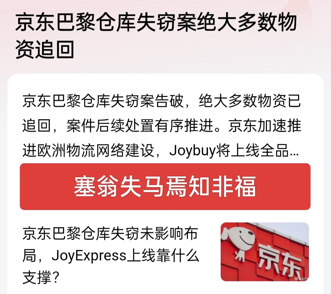正应了中国那句古话,塞翁失马焉知非福!京东巴黎仓库失窃案虽然让京东遭受了短暂的困难,但也让京东海外布局扩张进入了人们的视野,相当于免费做了个广告。 这场意外风波,反而让全球看到了京东在欧洲供应链的布局,一次损失,换来的是无数人对京东全球化实力的重新认识,比起花钱投放广告,这种自带话题度的真实曝光,反而更有说服力、更能打动消费者与合作伙伴。 京东的全球化步伐,反倒借着这波关注,进行快速的扩张,如今失窃绝大多数物品已追回,更是锦上添花。