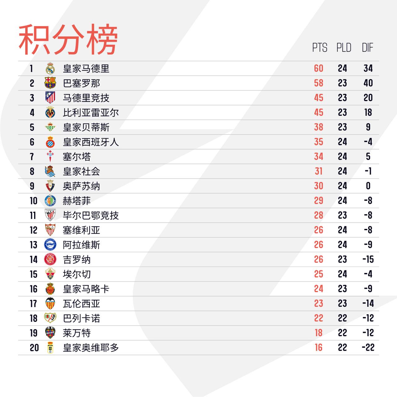 周六再赛4场 塞尔塔客场绝平皇家西班牙人 赫塔菲力克比利亚雷亚尔 塞维利亚阿拉维斯握手言和 @皇家马德里足球俱乐部 大胜皇家社会 积分榜方面皇马反超少赛一场的巴萨暂时登顶