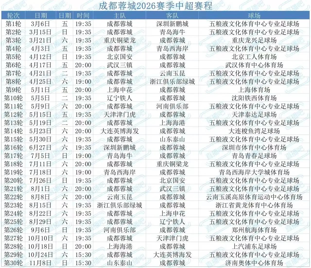 仔细一看,还真着急,中超联赛新赛季的赛程,旱时旱死,涝时涝死,6月、9月、11月只打1轮,很多队可能要相互热身让状态维系;而5月份竟安排7轮,占全年赛程近四分之一,赛事密集程度,与赛会制的杯赛也有一比。 固然有世界杯和国足比赛时间的考虑,但火红5月确实是各队熬得最艰难的时节。想起去年8月蓉城打了7场,随后就伤病不断、风光不再,这种苦头,各队今年都来尝一遍,大家都是吃苦不吃亏,比的是轮换阵容谁更牛逼。 但看蓉城5月对手,1号东进客战申花、5日北上客战铁人、9日回蓉战河南,15日再北上客战天津、19日又回蓉战海港、23日又去大连战英博,还有30日主战泰山,两个一周三赛,不说比赛,就这路途来回奔波也让人晕头转向的。
