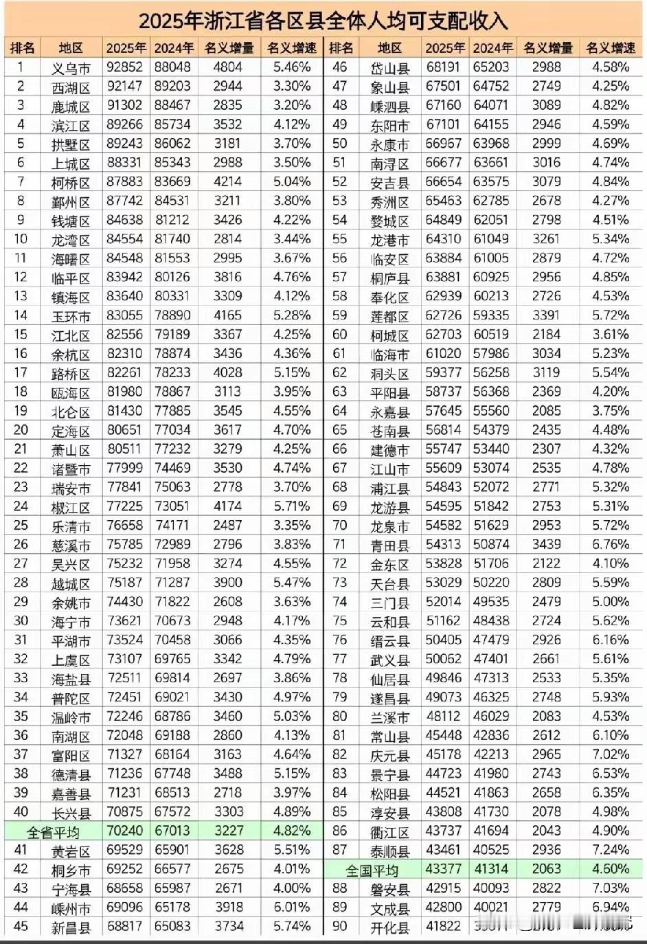 2025年浙江省各区县市人均可支配收入排名情况,图片里属于2025年浙江省各区县市人均可支配收入排名,浙江省的网友们可以看看自己家乡的区县市2025年人均可支配收入排名情况怎么样。