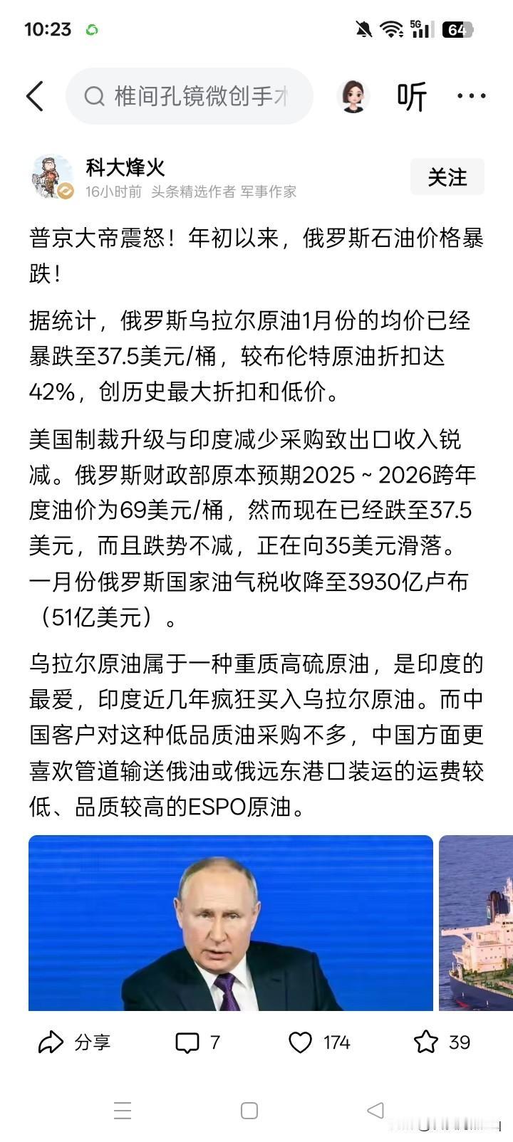 他又震怒了? 传闻说乌拉尔出口的石油,在1月份已经跌到了平均每桶37.5美元的新低价,与囯际上的油价相比,折扣高达42%,简直就是差不多腰斩了,因此,他又震怒了。 不过,相比此前网络上曾经有的消息说,乌拉尔出售的石油为每桶24美元左右的价格,37.5美元还是要高出来很多。但无论如何,这种事情,恐怕靠震怒是解决不了任何的问题。 如果真的震怒,不如放弃一切不切实际的计划,停止这场旷日持久的战争,从战场上撤军,还世间本来应该拥有的和平。 震怒不仅仅是解决不了问题,很可能因此更加增加对手的信心,让他们变本加厉,肆无忌惮。