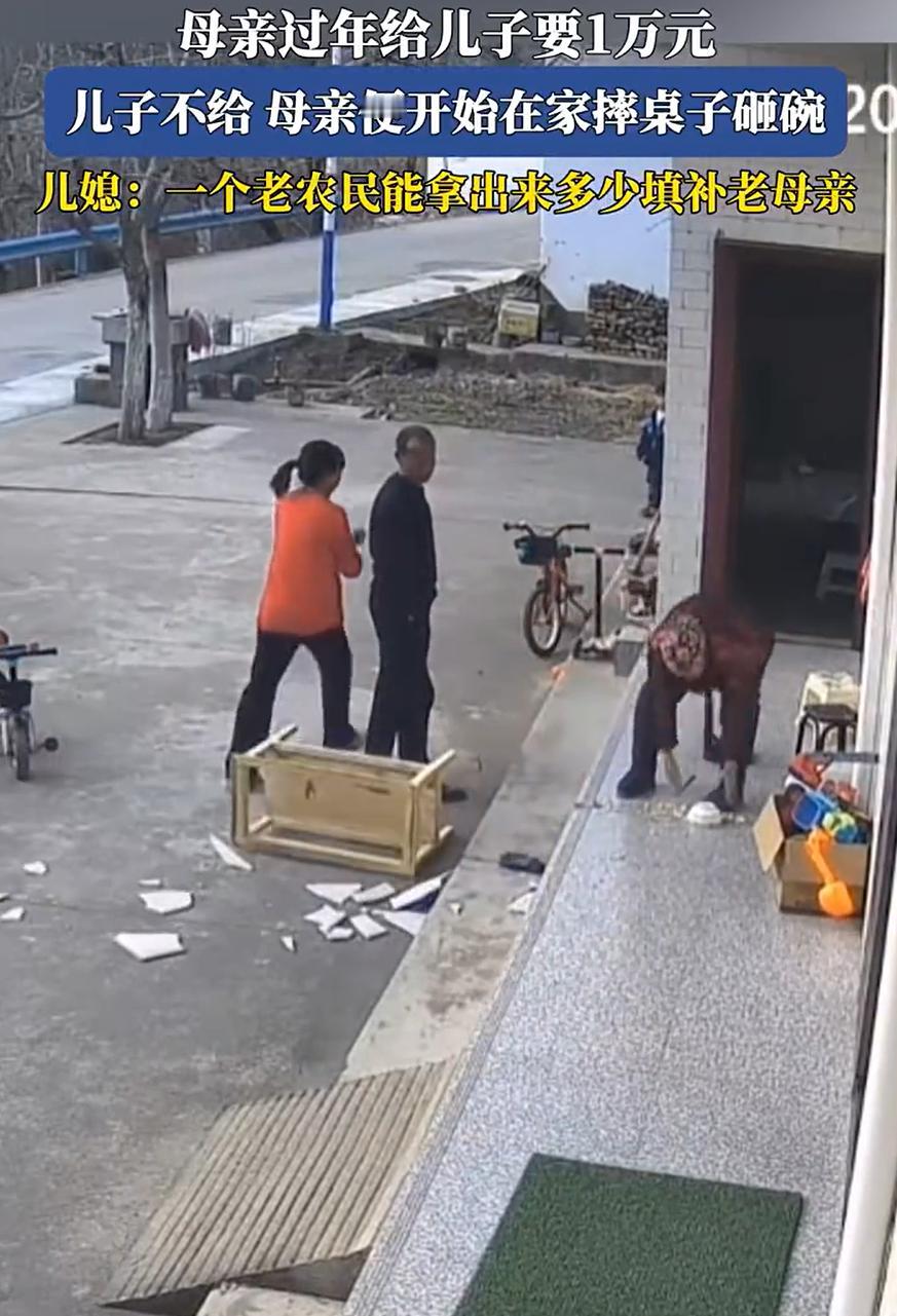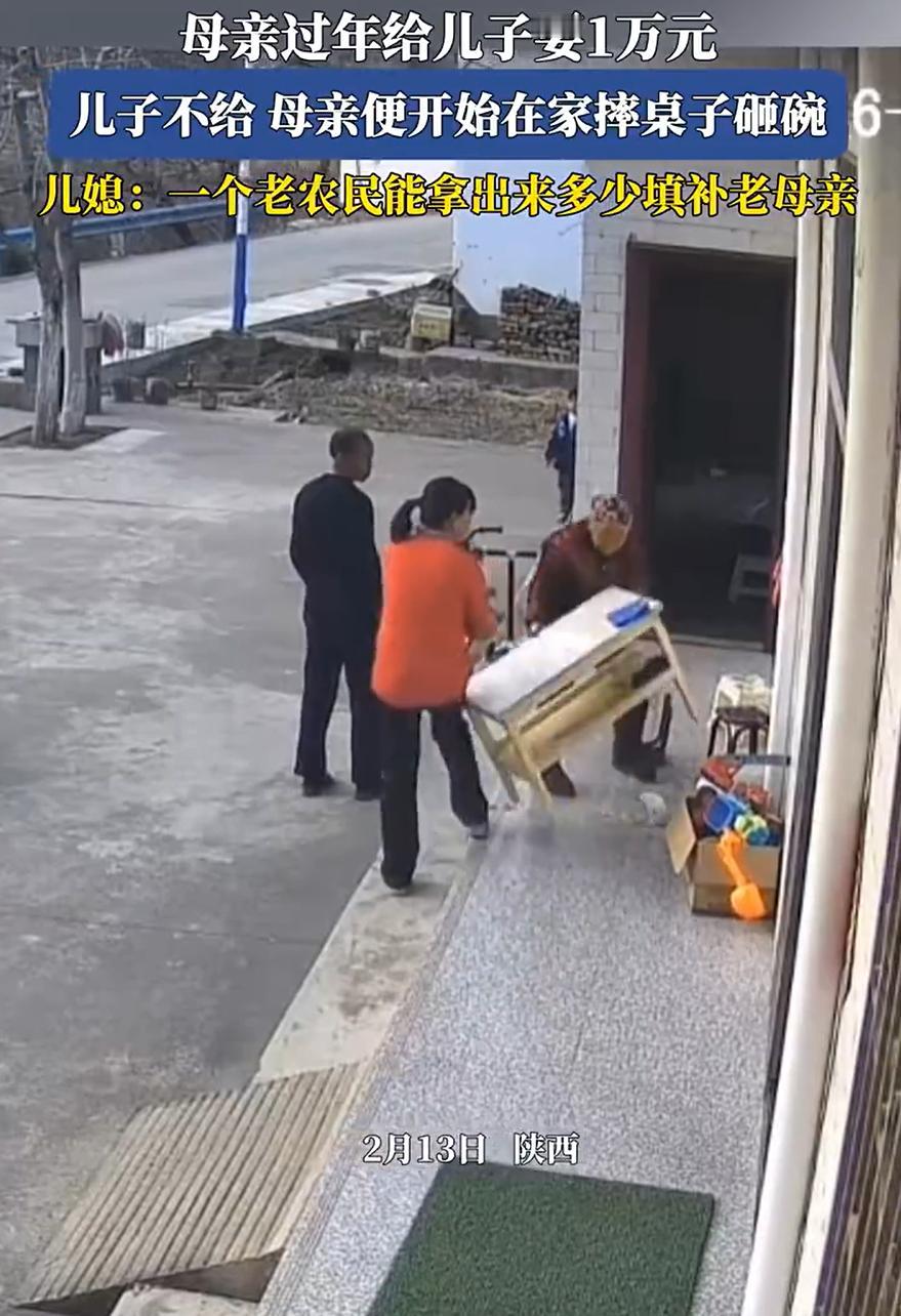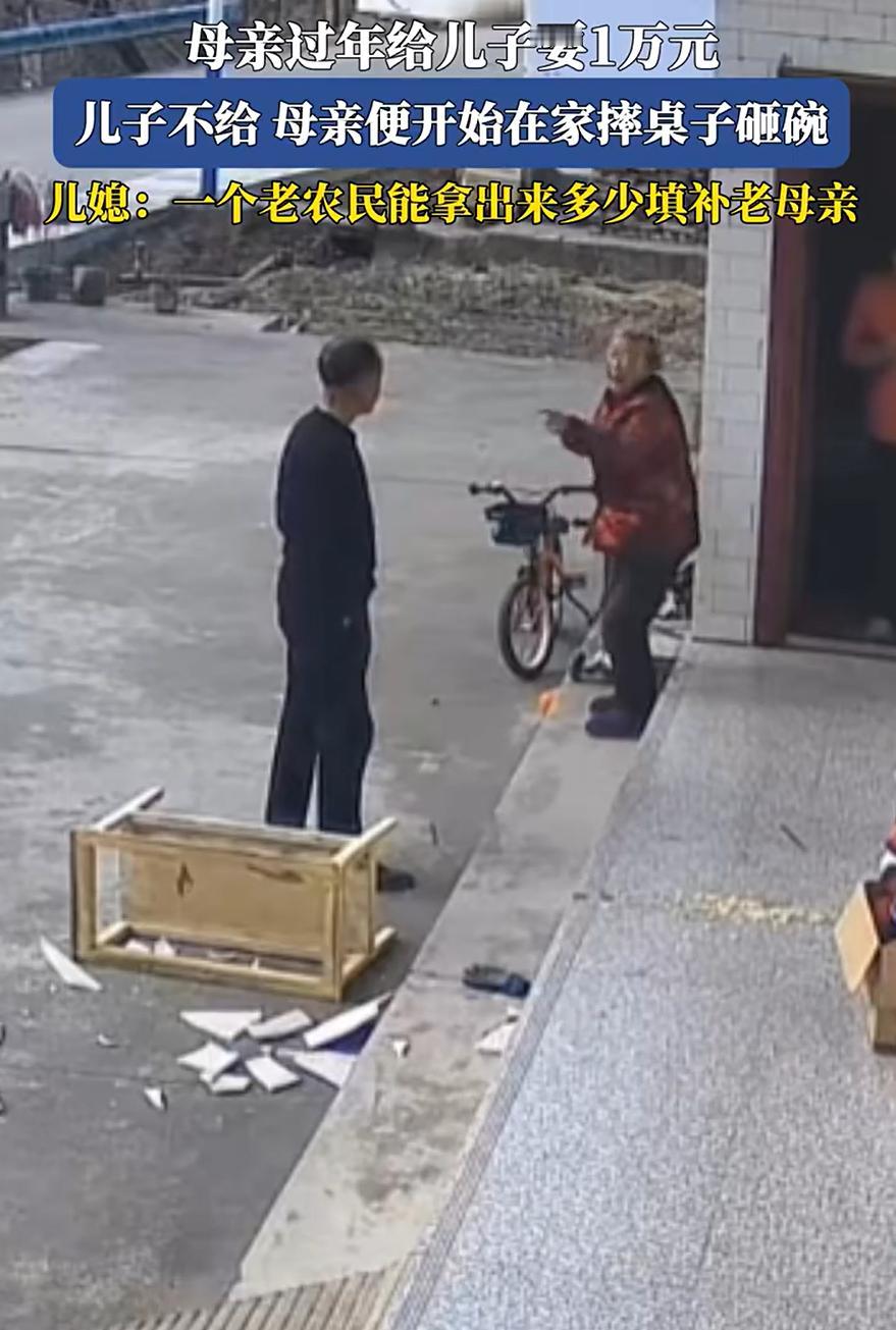 看的心酸!陕西,儿子儿媳过年回老家看望母亲,吃完饭老母亲突然朝儿子要10000块钱,儿子说手里没有,没成想,母亲突然摔桌砸碗,儿媳在一旁无奈说:一个老农民能拿出多填补老人 监控中,老人坐在院子里吃饭,儿子和儿媳站在旁边陪她聊天,这时老母亲突然开口,让儿子拿一万块钱出来。儿子当时就愣了,估计手里也是紧,老老实实回了一句:现在没有 谁能想到,就这么一句话,跟点了炮仗似的。老母亲当场就炸了,手一挥直接把桌子给掀了,碗筷盘子摔得稀里哗啦。这还不算完,周围能砸的东西她一样没落下,边砸边指着儿子骂。旁边的儿媳看着这场面,估计也是又委屈又无奈,只能在边上干看着,嘴里念叨了一句:一个老农民,能拿出多少来填补老人啊 说实话,看老太太砸东西那个利索劲儿,火气是真的不小 网友们在底下也吵翻了天,有的说这老太太年轻时估计也是个厉害角色,不然不能这么冲动 但更多的还是不理解:你一把年纪了,要那么多钱干啥?真要是病了,让儿子带你去医院;馋嘴了,让他给你买肉吃。为啥非得死咬着要一万块这个数? 咱也得说句公道话,这种闹法,最伤感情。老人觉得是子女不体谅,子女觉得是老人不懂事。本来血浓于水的一家人,硬生生被钱逼成了红脸的仇人。儿媳那句无奈的话,其实也代表了现在很多小家庭的心声:不是不养你,是咱们得在能力范围内,量力而行 无论经济条件如何,家庭成员之间的关怀和沟通才是解决问题的根本。钱固然重要,但它不能成为亲情的唯一标准,可惜的是,这种道理不是人人都懂