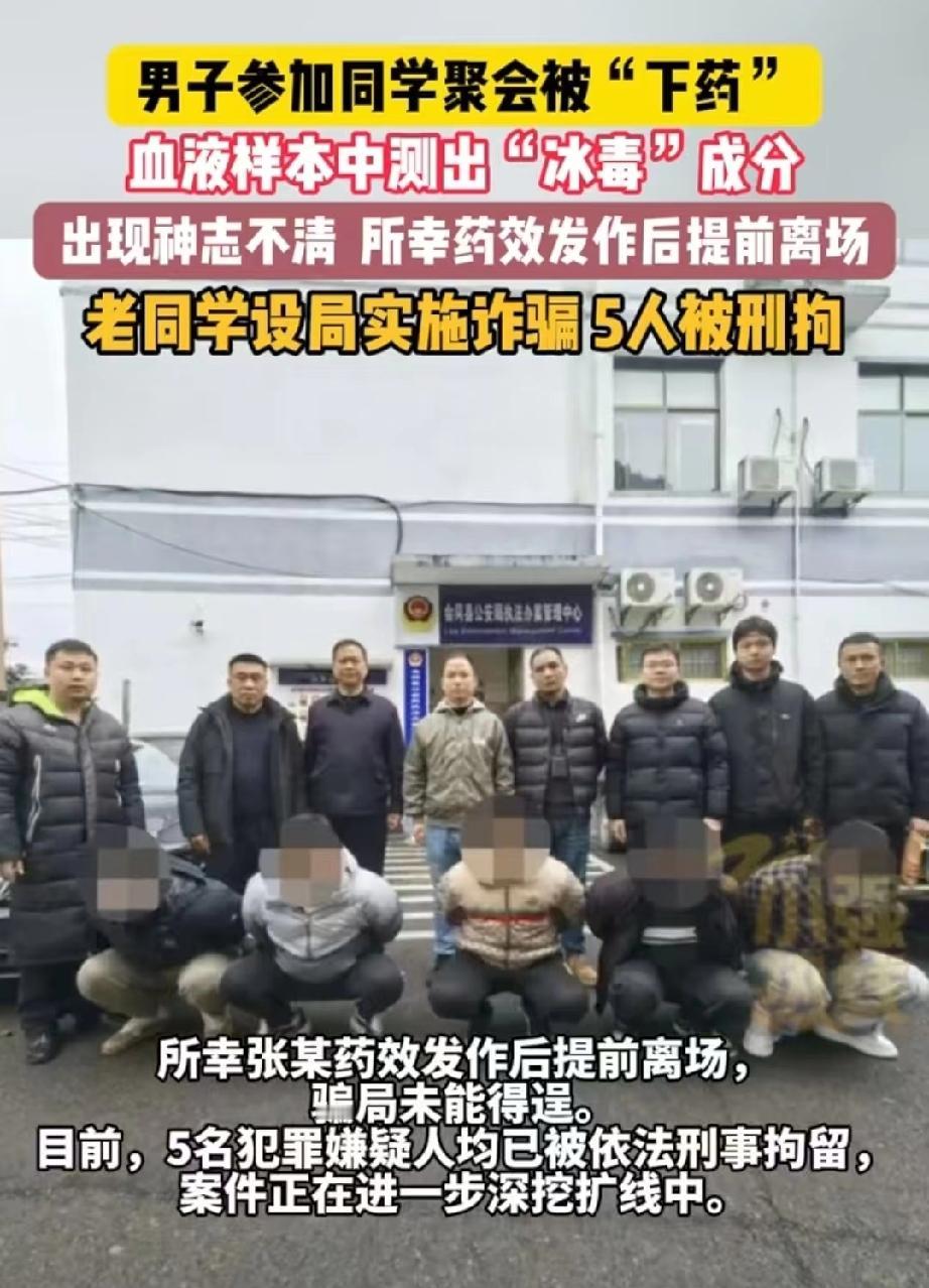 让人后怕!湖南娄底,男子突然接到老同学电话,说许久未见,想请他吃饭叙旧,男子没有多想马上赴约。酒桌上,同学可劲儿给他敬酒,几个回合下来,男子头晕目眩,支撑不住先行离开。回家后,男子意识模糊,神志不清,家人意识到不对劲,马上报警。谁知,警方竟从男子体内查出“冰毒”成分,随着调查的深入,背后的真相让人心惊胆战。 2025年11月,张某突然接到老同学林某的电话,林某在电话里热情地表示,多年未见,特别想念大家,想组个局聚一聚。 张某听闻,心中满是欣喜,想着多年未聚的老同学情谊珍贵,便毫不犹豫地答应了。 聚会当日,张某特意收拾了一番,按时来到酒店包间,一进门,林某已经到了,还带着几个不太熟悉的人。 林某介绍说,这些都是他的好朋友,大家一起吃个饭认识认识,以后好多来往。多条朋友多条路,张某便没有多想。 饭桌上,林某等人格外热情,轮番给张某劝酒。 起初,张某还推辞着,称自己酒量不佳,林某等人却笑着说,多年未见的老同学相聚,必须喝尽兴,不喝就是不给大家面子。 张某考虑到都是老同学,不想驳了大家的面子,便一杯接一杯地喝了起来。 喝着喝着,张某渐渐感觉不对劲。他开始头晕目眩,视线也变得模糊,整个人轻飘飘的。 没想到,这酒劲儿怎么这么大,自己并未喝多少,但当时他并未往坏处想,只当是自己状态欠佳。 没过多久,张某实在支撑不住,不顾林某阻拦,便提前离场回了家。 回到家后,他的症状不仅没有缓解,反而愈发严重,整个人神志不清,意识模糊得厉害。 张某的家人见状,惊恐不已,赶忙询问他发生了什么事。 张某迷迷糊糊地将参加同学聚会的事情讲述了一遍。家人越听越觉得蹊跷,怀疑张某是被人暗中“下药”,于是急忙报警。 派出所接到报警后,分局高度重视,立即展开侦查。 民警先调取了聚会地及周边的多处监控视频,同时,提取了张某的血液样本进行鉴定。 很快,鉴定结果出炉,确认张某体内含有“冰毒”成分。 这可把所有人吓了一跳,民警们也意识到事情的严重性,通过分析同行人员的活动轨迹和关系网络,逐步锁定了以林某、黄某为首的5名嫌疑人。 经过深入调查,民警们揭开了一个惊人的阴谋。 原来,黄某、林某等人在怀化密谋,计划通过“组局杀猪”的方式牟利。 他们打算在聚会中“下药”,使受害人意识模糊,然后再通过赌局“出千”实施诈骗。 林某以叙旧为名,与其余团伙成员来到娄底找老同学张某聚餐,将张某当作他们的“猎物”。 在宴请过程中,几人轮番劝酒,趁张某不备,将含有“冰毒”的酒水让他饮用。 张某得知真相后,冷汗直冒,心惊胆战。他庆幸自己提前离场,否则真不知会遭遇何种可怕之事。 2月12日,公安部门将该团伙成员一网打尽。 《刑法》第266条规定:诈骗公私财物,数额较大的,处三年以下有期徒刑、拘役或者管制,并处或者单处罚金;数额巨大或者有其他严重情节的,处三年以上十年以下有期徒刑,并处罚金。 林某等人以同学聚会为幌子,预谋下药致被害人意识模糊,意图通过赌局出千非法占有他人财物,属于以虚构事实、隐瞒真相的手段实施诈骗,完全符合诈骗罪的构成要件。 同时,林某等人在酒水内偷偷添加冰毒,违背被害人意愿使其被动吸毒,还触犯《刑法》第353条:强迫他人吸毒罪,依法应处三年以上十年以下有期徒刑,并处罚金。 林某等人以诈骗为目的,同时实施强迫他人吸毒的手段行为,依法应数罪并罚。 目前,5名犯罪嫌疑人均已被依法刑事拘留,案件正在进一步深挖扩线中。 真是让人后怕,张某的遭遇也提醒大家,就算是老同学、老朋友组局,也一定要多留个心眼。 在外吃饭喝酒,杯子别离开自己视线,不喝来路不明的酒水,别人拼命劝酒更要警惕,千万别碍于面子硬撑,保护好自己才是最重要的。
