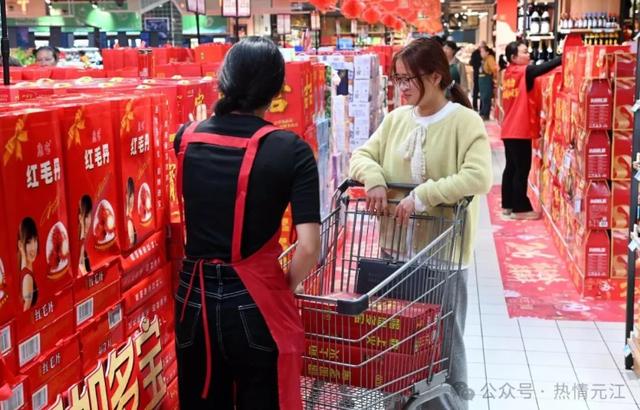 超市负责人吴春玲说:“我们这几天客流明显增加,主要购买米、面、油、奶等年货。为应对高峰期,招了30个假期工,每天多次加货,备货充足。春节期间我们不打烊,为大家服务好,祝大家新春快乐!”