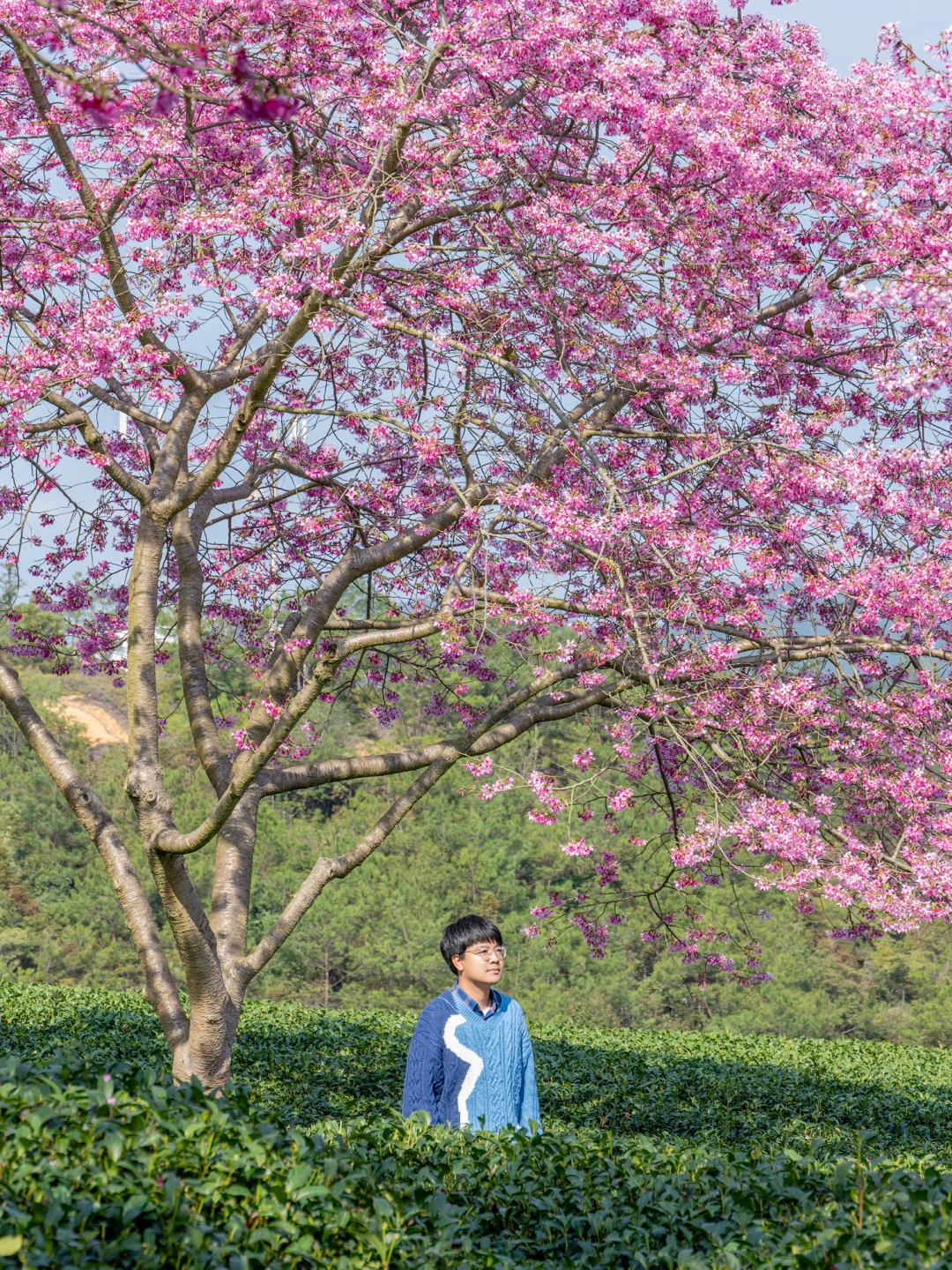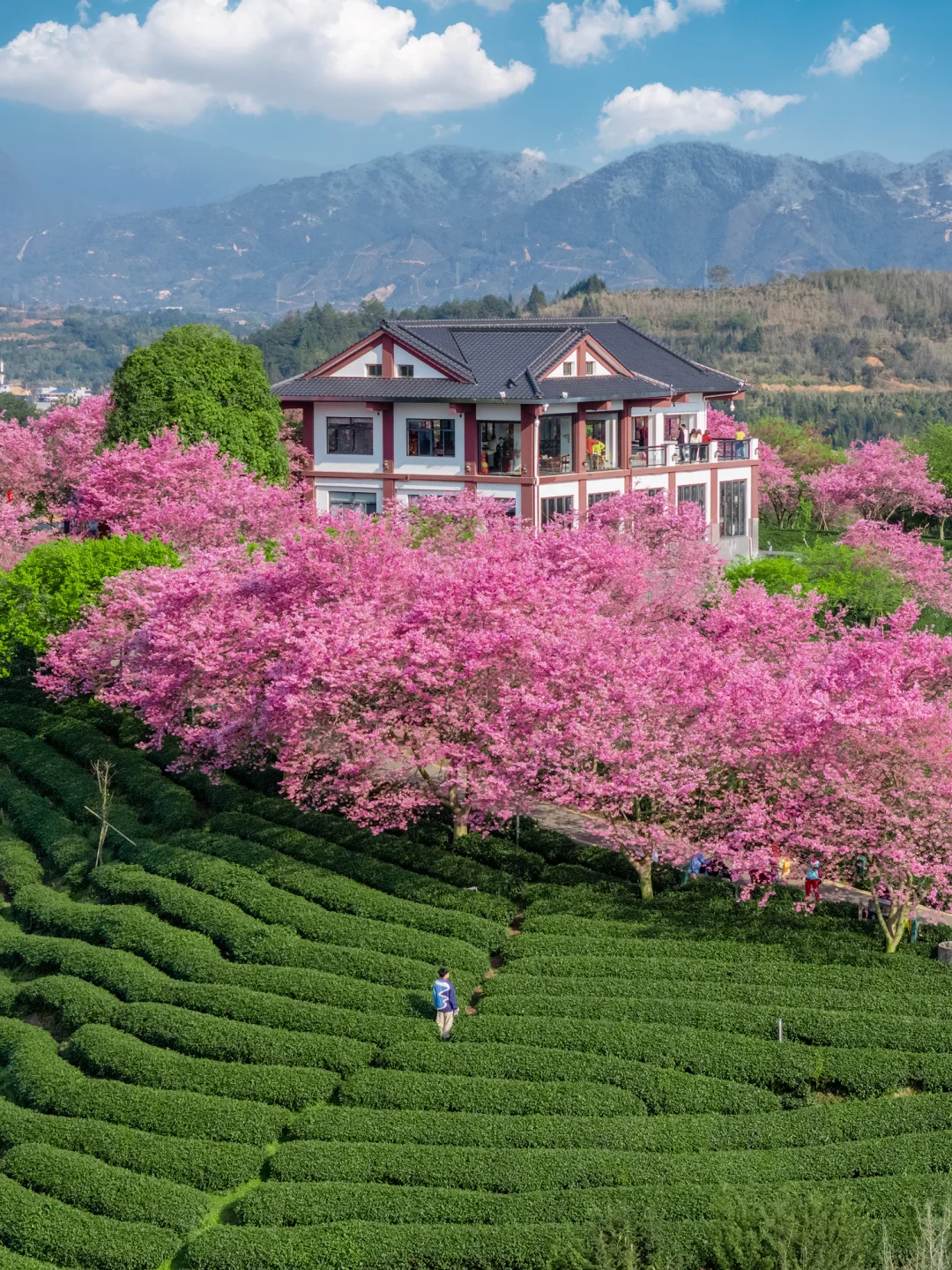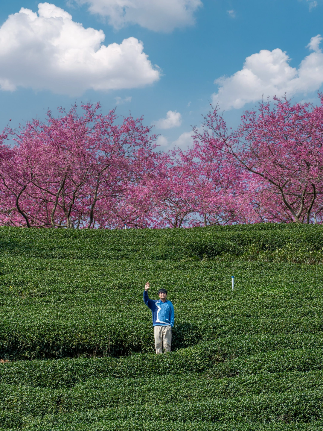每年二月开始5个不同品种的樱花就会相继绽放、搭配绿色的茶园真的很出片