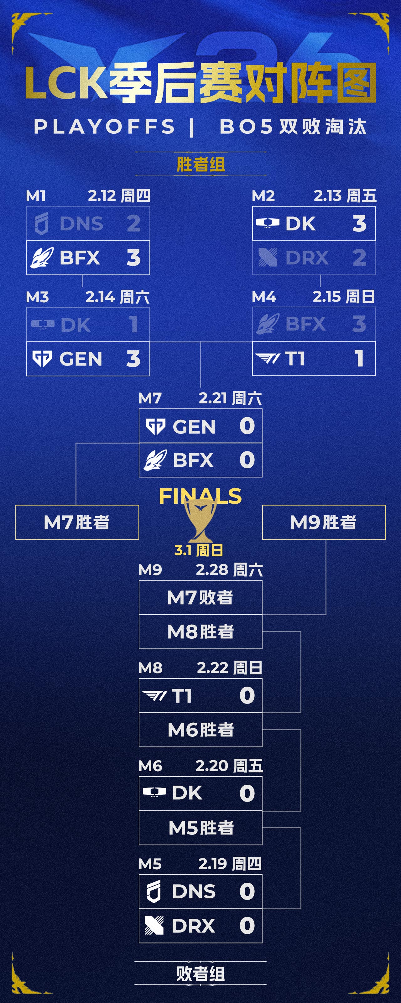 (各位JRs亦可参照文末指引,前往虎扑英雄联盟赛事页查看实时更新的完整LCK季后赛对阵图)