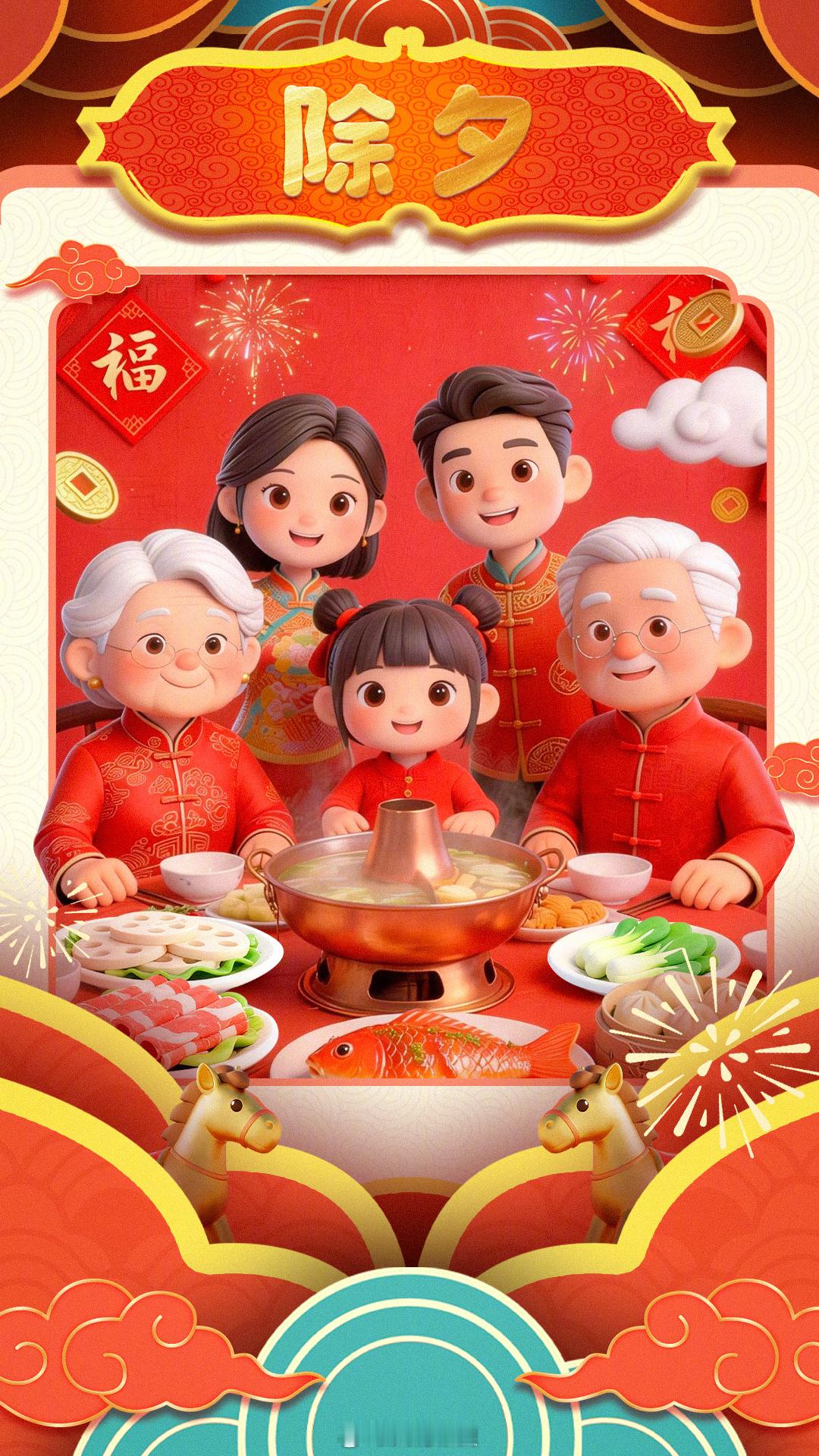 菜鸟军虫 马年拜年朋友圈【除夕福到团圆到接福啦!】今天是除夕 愿你在新的一年,马力全开,一马当先,马到成功!