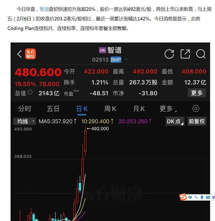 离马年仅剩1天,斗胆预测,年后又将爆炒智谱概念股。 智谱1月8日先在港交所上市,发行价116.2港元/股,但年前突然来了热度,到2月13日股价涨至485,开始变离谱。信心大增的智谱近日宣布,请国泰海通和中金辅导,准备在A股上市。 参考此前摩尔和木曦上市前相关个股的表现,智谱上市前吹风,必将让大A的智谱生态链打开想象空间,迎来一番炒作。