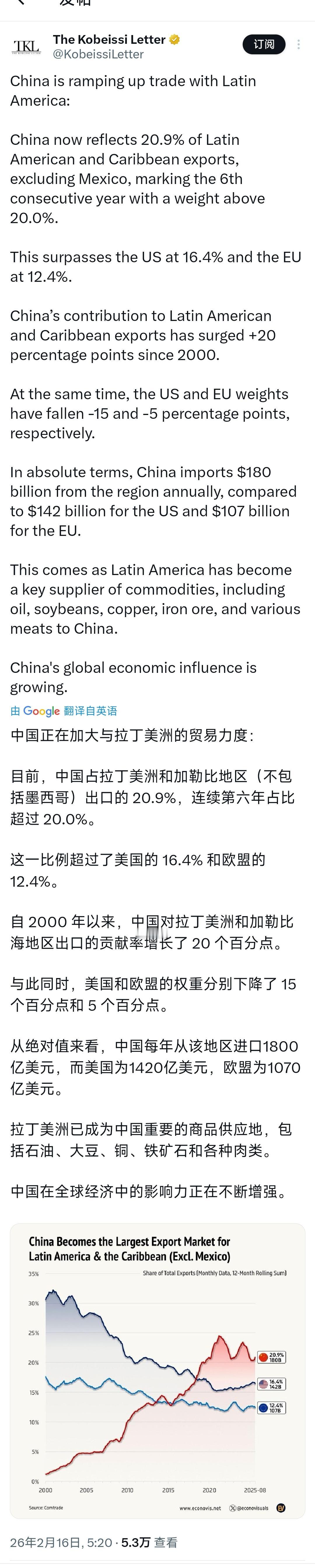 全球资本市场评论刊物 Kobeissi Letter今天(2月16日)写道:“中国正在加大与拉丁美洲的贸易力度。目前,中国占拉丁美洲和加勒比地区(不包括墨西哥)出口的20.9%,连续第六年占比超过20.0%。这一比例超过了美国的16.4%和欧盟的12.4%。 自2000年以来,中国对拉丁美洲和加勒比海地区出口的贡献率增长了20个百分点。 与此同时,美国和欧盟的权重分别下降了15个百分点和5个百分点。 从绝对值来看,中国每年从该地区进口1800亿美元,而美国为1420亿美元,欧盟为1070亿美元。 拉丁美洲已成为中国重要的商品供应地,包括石油,大豆,铜,铁矿石和各种肉类。中国在全球经济中的影响力正在不断增强。” [机智]评几句:这组数据清晰勾勒出全球经贸格局的深刻转向,不是短期波动,而是结构性、不可逆的权力转移。拉美以石油、大豆、铜、铁矿石等关键资源对接中国庞大市场需求,中国以稳定、平等、不附加政治条件的合作赢得信任,本质是发展中经济体互利共赢的必然选择,对比美欧长期将经贸与政治捆绑、动辄制裁施压的霸权逻辑,高下立判。美国在拉美经营百年却不断流失份额,根源在于只讲地缘私利、无视地区发展诉求,中国用实打实的贸易与投资打破垄断,既稳固自身能源资源安全,也为拉美注入增长动能,这不是地缘扩张,而是公平合作对强权掠夺的替代,标志着全球南方自主选择发展道路、摆脱单一依附格局的时代到来,中国的全球经济影响力,正是在这样的务实合作中稳步增强。