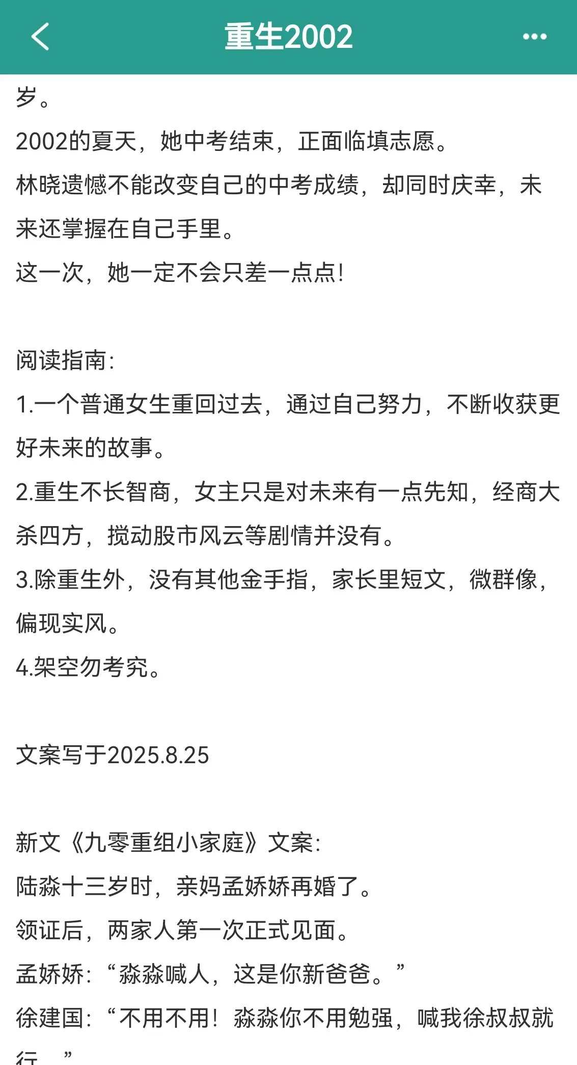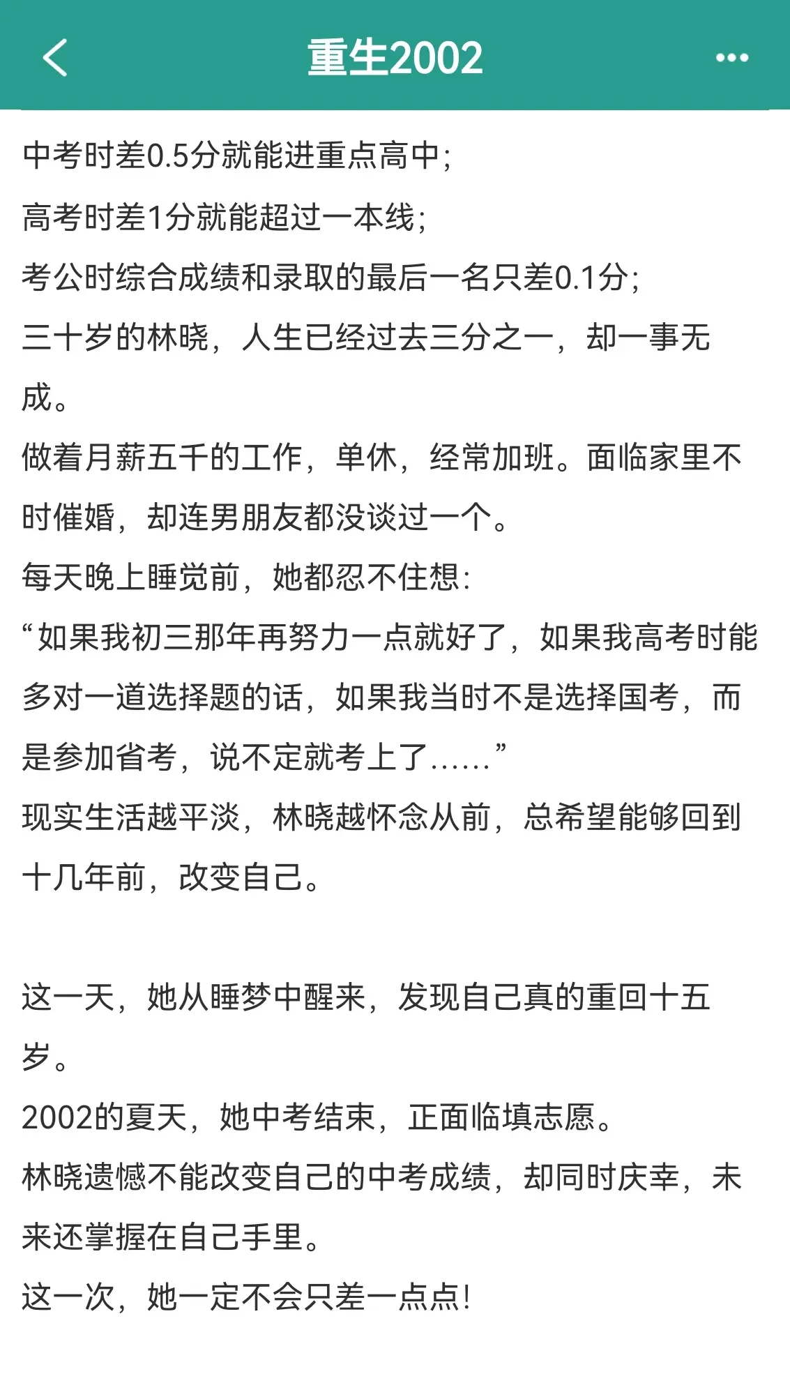 重生2002。作者PS:阅读指南: 1.一个普通女生重回过去,通过自己努力,不断收获更好未来的故事。 2.重生不长智商,女主只是对未来有一点先知,经商大杀四方,搅动股市风云等剧情并没有。 3.除重生外,没有其他金手指,家长里短文,微群像,偏现实风。 4.架空勿考究。