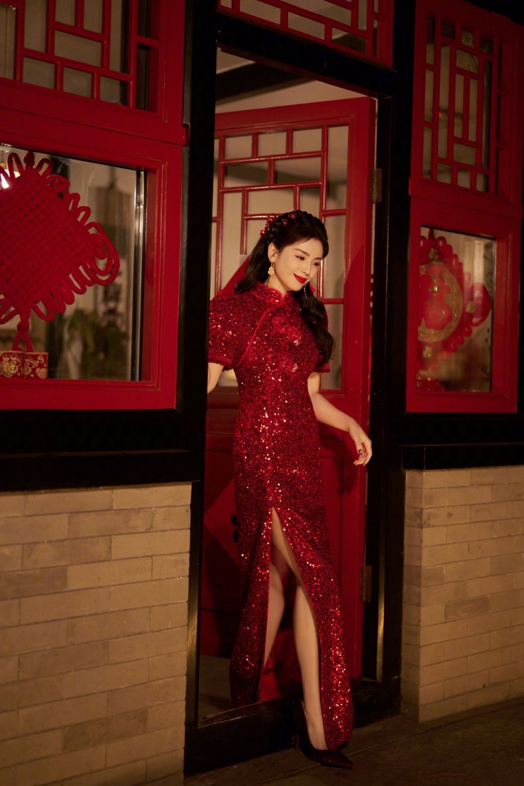 刘涛春晚旗袍造型 刘涛身着M ESSENTIAL石榴垫绣霞光绣布定制旗袍,红韵流
