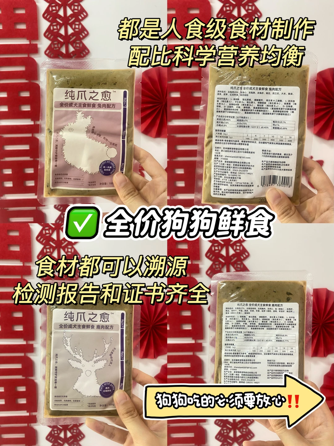 姨姨们都吃过丰盛的年夜饭了吗?小狗我的年夜饭有麻麻买的好吃的鲜食耶🍖,欧一西~➡纯爪之愈的尝鲜套装,麻麻直接安排了4种口味,鸡肉、鸭肉、兔肉和鹿肉换着吃,小狗我都很喜欢吃嘿嘿😋,吃饭都超开心!