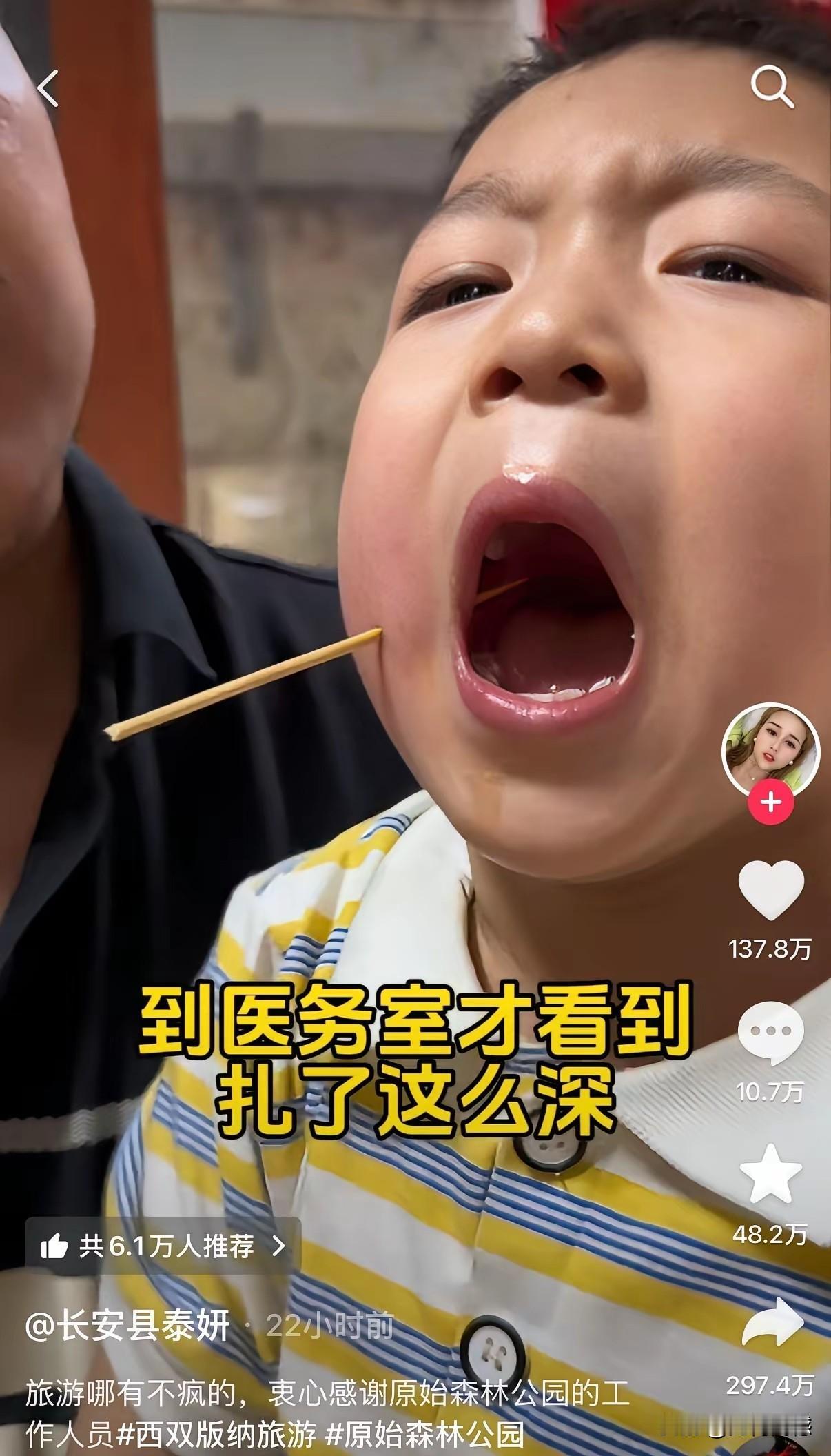 这小孩子吃串子,怎么自己被穿上了?感觉这个事不太寻常,也许孩子在吃串子的过程中,是边吃边跑边玩,结果由于不小心摔了一个跟头,于是竹签子就直接插进了孩子的腮帮子里,这仅仅是一种猜测,但是不管怎么说,小孩子吃东西一定要多加小心!