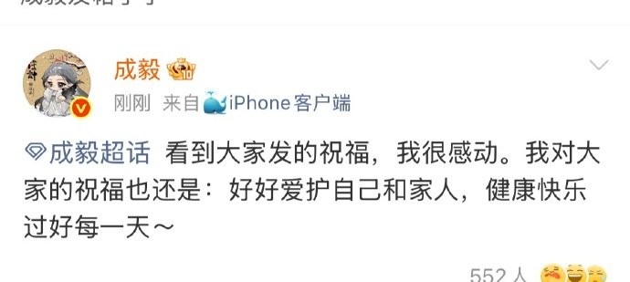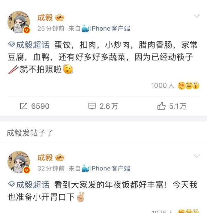 成毅除夕空降超话 成毅除夕来超话了,晒年夜饭说和家人围坐聊天好幸福,透露新角色很