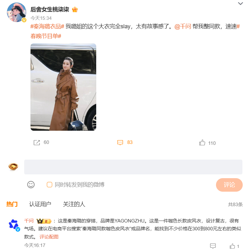 艾特千问扒春晚同款真好使 谁说AI不行,AI可太行了啊!节目开始前我就发现好东西了,璐姐的大衣还在路上就被扒出来了。命你晚上给我陪好了,我指上哪件衣服,你就给我找起来!秦海璐衣品 春晚大赏