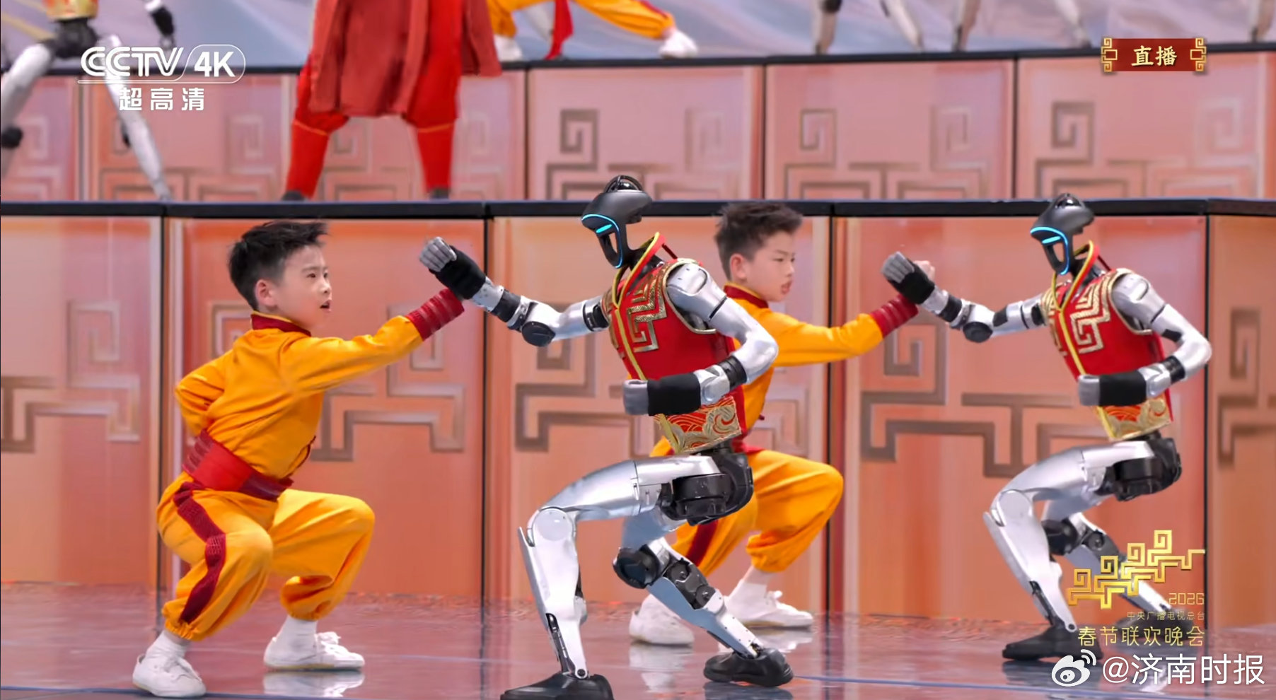 【#春晚机器人太灵动飘逸了# 】#春晚# 央视2026年春节联欢晚会如约上演,一场科技与武术的跨界融合惊艳全场!节目《武BOT》中,宇树科技机器人与河南塔沟武术学校的少年们同台共舞,人机配合行云流水,动作灵动飘逸,仿佛未来已来。 #春晚节目单#