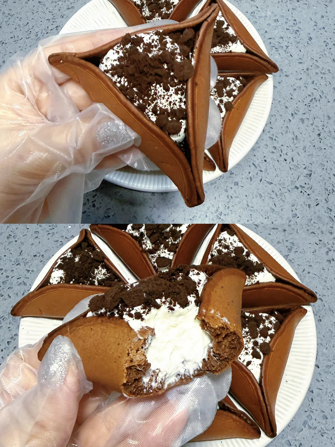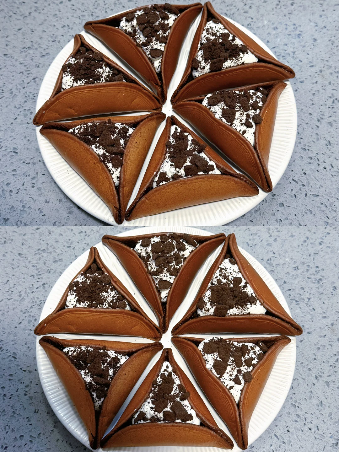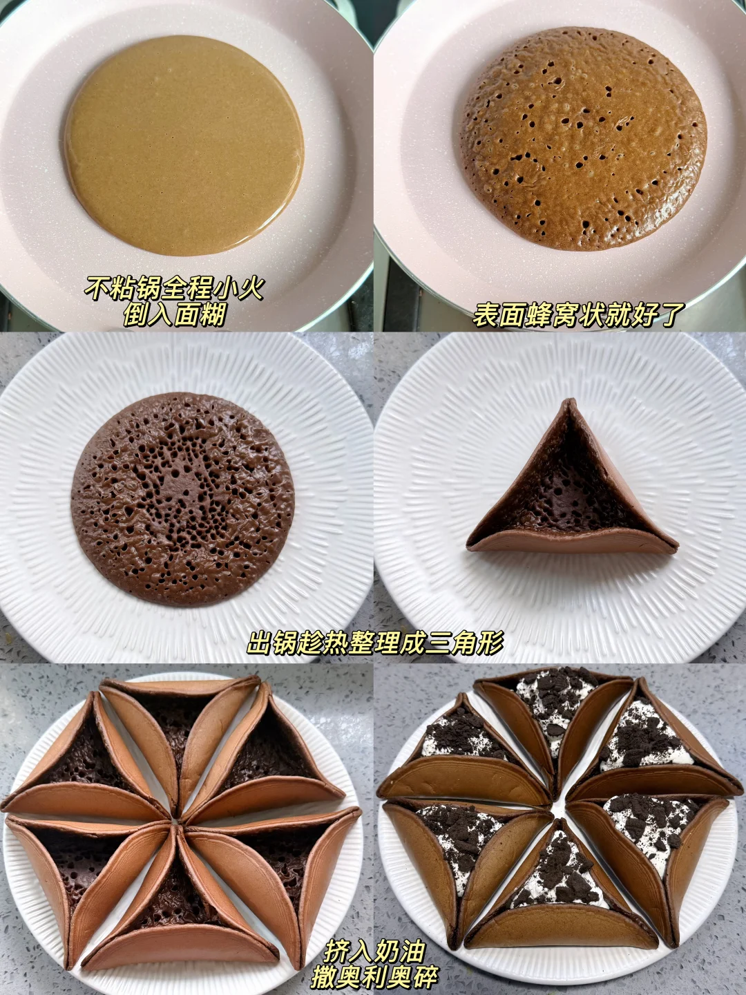 松软的饼皮配上奶油和奥利奥 三重口感,超级好吃! 💕饼皮:鸡蛋2个,糖20克,牛奶140克,低筋面粉110克,可可粉20克,泡打粉3克 1.碗里打入鸡蛋,加糖和牛奶搅拌均匀,加入低筋粉和泡打粉搅拌均匀,过筛,盖保鲜膜静止20分钟 2.不粘锅开小火,倒入一勺面糊,表面呈蜂窝状后拿出来,趁热整理成三角形。(旁边放一个湿毛巾,每做完一个饼皮给不粘锅降降温) 3.奶油加糖打发,挤入松饼中,表面撒奥利奥碎