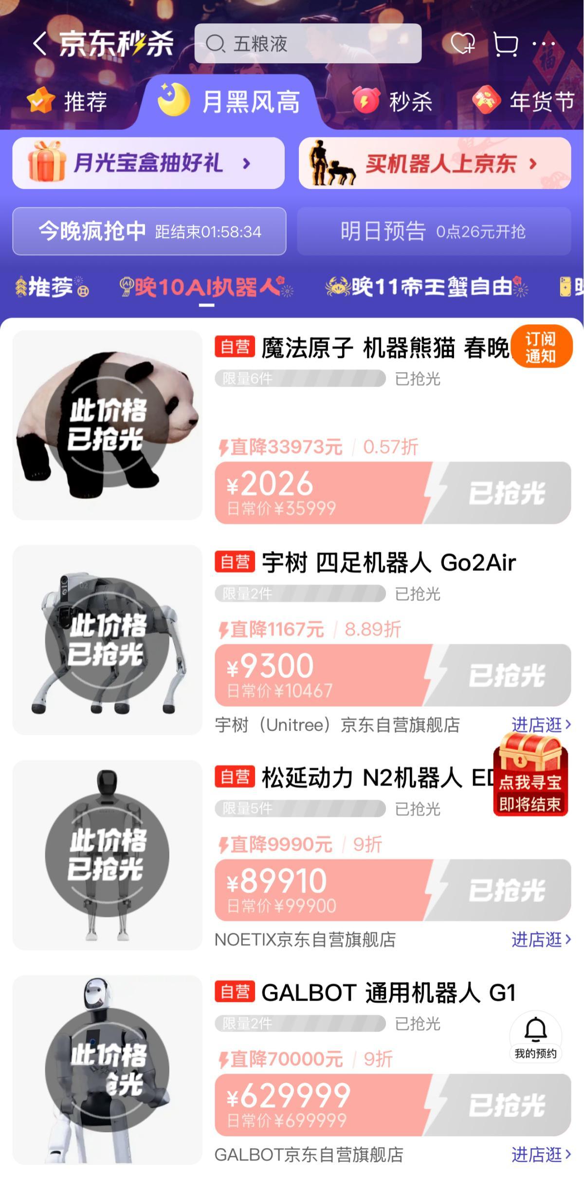 值得一提的是,在除夕当晚10点,京东“月黑风高”超级盛典中,也上架了包括“春晚同款”机器人在内的多款机器人,更有限时优惠。而在活动上线几分钟内,包括魔法原子、宇树科技、松延动力等品牌的机器人即被抢购一空。其中,两台价值62999元的GALBOT通用机器人G1,同样被瞬间抢购。