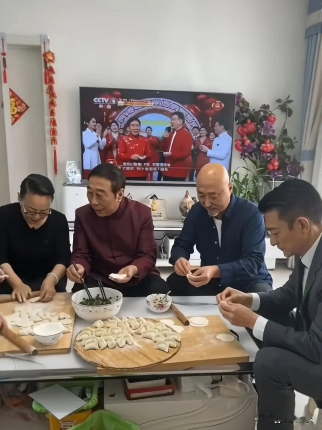 这桌也太有排面了!赵本山、宋丹丹、陈佩斯、冯巩这几位喜剧界的“顶梁柱”居然凑一块儿了,旁边还坐着刘德华,这阵容真是想都不敢想。真好奇他们是怎么聚到一起的。更有意思的是,天王刘德华居然还会包饺子,一点架子都没有。这画面看着就暖心,老熟人聚在一起包着饺子,年味儿瞬间就拉满了。