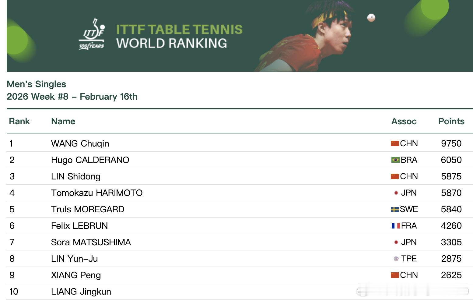 【孙颖莎连续188周霸榜世一】国际乒联2026第8周排名 2月16日,国际乒联2026年第8周世界排名公布。女单方面,10125分连续第188周霸榜第一,8248分排名第二,陈幸同5375分排名第三。男单方面,9750分排名第一,雨果6050分排名第二,5875分排名第三。