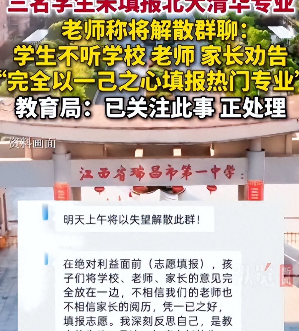 江西三个学霸,高考分数够得上清北分数线,结果人家偏偏不报清华北大,选了复旦、交大、浙大的王牌专业。本来这是再正常不过的选择了吧,没想到班主任老师直接在群里发飙了,还威胁要解散微信群。