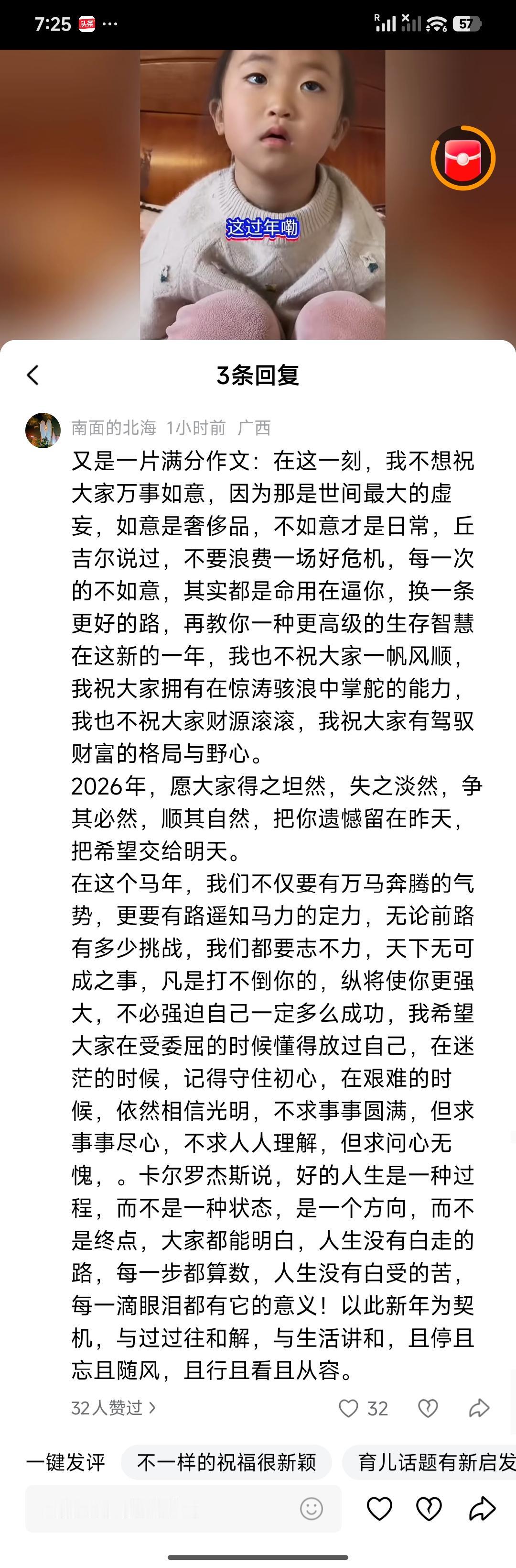 “满教授”不一样的新年祝福 昨天除夕,马年新年到来之际,微信朋友圈、抖音、头条等等平台上,拜年祝福的吉祥语充满了世界。然而,唯有“满教授”的祝福语与众不同…… 过年了,满妈妈让“小满儿”对大家说几句祝福语,结果是一语惊破天下人啊! 看看“小满儿”说了些啥:“我不想祝大家万事如意,因为那是世间最大的虚妄,如意是奢侈品,不如意才是日常。”接着还引用了丘吉尔的一句话“不要浪费一场好危机,每一次的不如意,其实都是命运在逼你换一条更好的路,在教你一种更高级的生存智慧。” “在这新的一年里,我也不祝大家一帆风顺,我祝大家拥有在惊涛骇浪中掌舵的能力!我也不祝福大家财源滚滚,我祝福大家拥有驾驭财富的格局与野心!” 试问“小满儿”这三句祝福,哪位大学教授能说出来? 还有:“2026年,愿大家得之坦然,失之淡然,争其必然,顺其自然。把你的遗憾留在昨天,把你的希望交给明天!” 接着,就农历马年,“小满儿”说:“在这个马年,我们不仅要有万马奔腾的气势,更要有路遥知马力的定力,无论前路有多少挑战,我们都要(知道)志不立,天下无可成之事,凡是打不倒你的,纵将使你更加强大,不必强迫自己一定多么成功,我希望大家在受委屈的时候懂得放过自己,在迷茫的时候,记得守住初心,在艰难的时候,依然相信光明,不求事事圆满,但求事事尽心,不求人人理解,但求无愧于心。” 这个时候,还引用了人本主义心理学创始人卡尔罗杰斯的一句话“好的人生是一种过程,而不是一种状态,是一个方向,而不是终点。”接着她总结性地说:“大家都明白,人生没有白走的路,每一步都算数,人生没有白受的苦,每一滴眼泪都有它的意义!以此新年为契机,与过往和解,与生活讲和,且停且忘且随风,且行且看且从容。” 再试问:这么深刻的人生哲理,你相信出自四岁女孩之口吗? 如果说高考作文题目是“新年祝福语”,“小满儿”这篇能不能得满分?[玫瑰][呲牙]