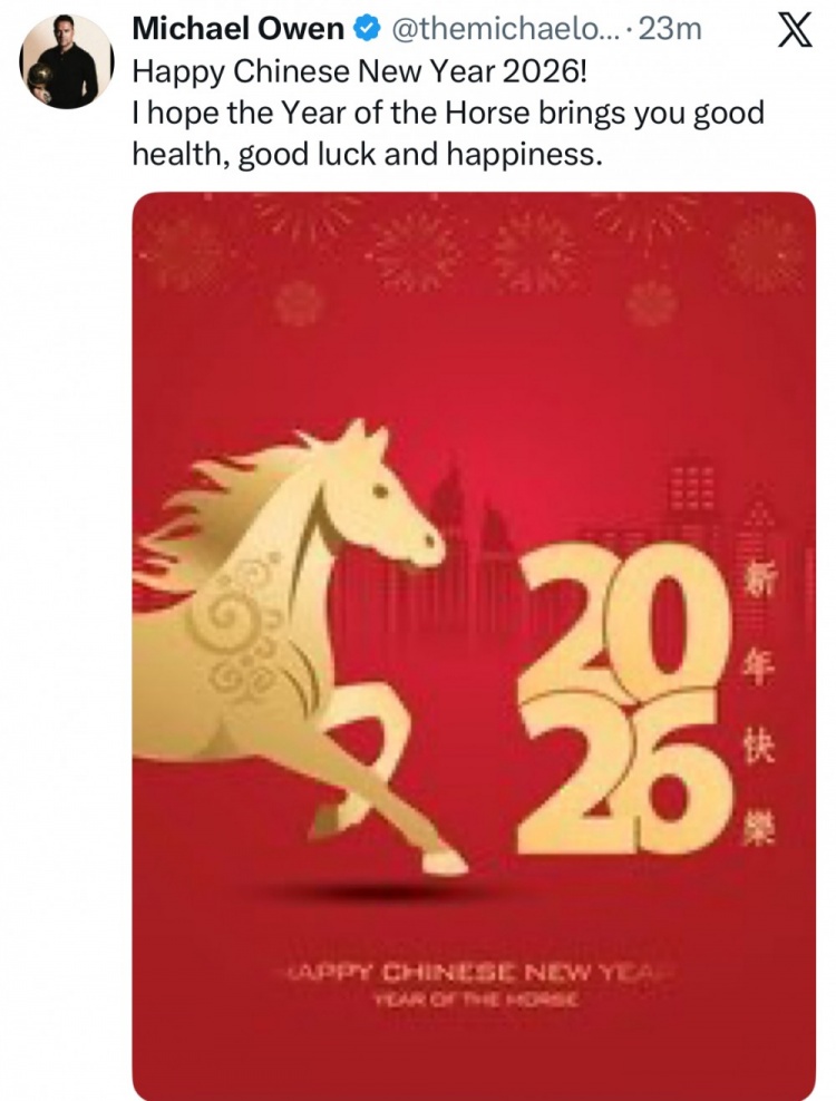欧文在社媒写道:“2026年新年快乐!马年到,祝愿各位身体健康,吉祥如意,事事顺心。”