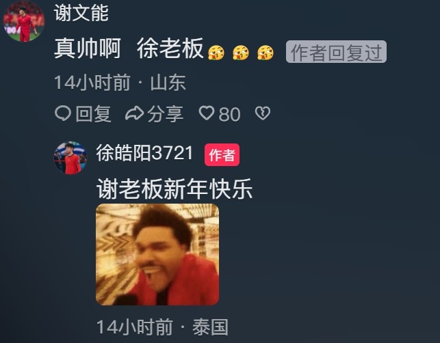 谢文能在评论里回复:“真帅啊,徐老板。”另外,戴伟浚、彭鹏等人也留言为徐皓阳送上新年祝福。