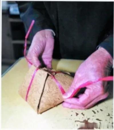 在温州地区,正月期间,人们走亲戚互相庆贺新年,街面上能看到许多拎着“它”四处走亲访友。 过去民间有种说法,如:“初一拜殿门,初二拜丈人”。 送“纸蓬包”,其实就是登门拜访时的伴手礼,是一种极具地方特色的传统民俗,里面承载着浓厚的亲情味。 “纸蓬包”是温州旧时春节拜年特有的礼品包装形式,通常是晚辈于正月初二至十五期间,拜访上辈及亲友时,“纸蓬包”则是随手带上一份伴手礼。 它与现今礼品盒不同,而是用本地特产的黄色草纸(俗称“纸蓬”)包裹干货礼品:柿饼、红枣、桂圆干之类的南北货。 包纸蓬包需要有一定的功底,成品要棱有角。面层还需覆以印有吉祥图案的红纸,文革时期都是印有样板戏剧照彩纸,再用麻线或红线以“廿”字形扎紧,形成梯形或斧头状的包裹,便于提携。 当时还有一个传说:家主人在收到“纸蓬包”时一舍不得吃暂时放在桌子上,家里的嘴馋小孩,趁大人不在时,想办法从包缝中,抠出几个枣人偷吃解馋。大人却转手将此包送出,结果这个“纸蓬包”经过几轮转送,包内几乎成为空壳啦。