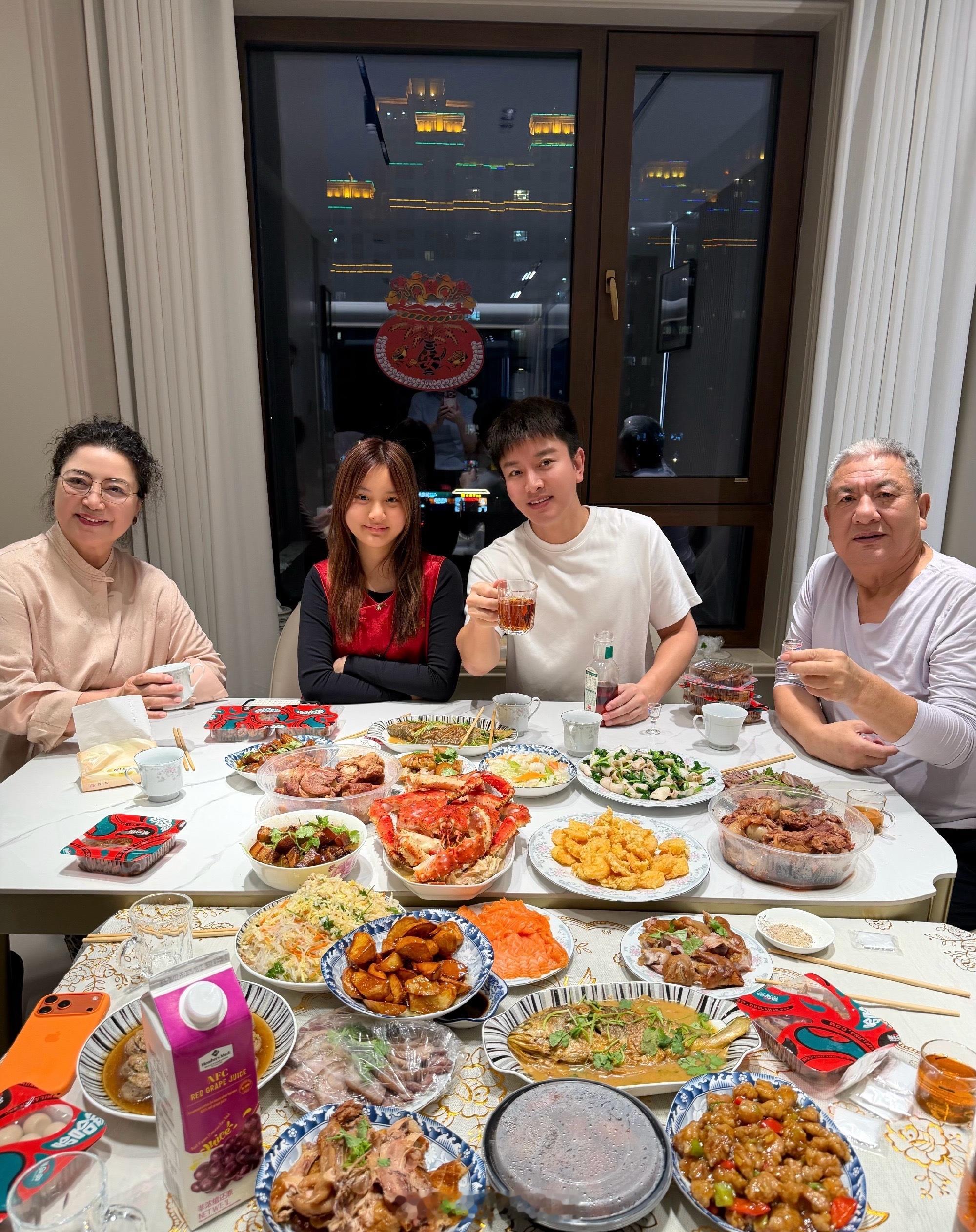甜馨跟爸爸爷爷奶奶一起过年 看贾乃亮家年夜饭给我看饿了!帝王蟹、三文鱼、大肘子、烧鸡、拔丝地瓜…摆了两大桌!甜馨被奶奶搂在怀里吃饭,这隔代亲的待遇也太幸福了吧