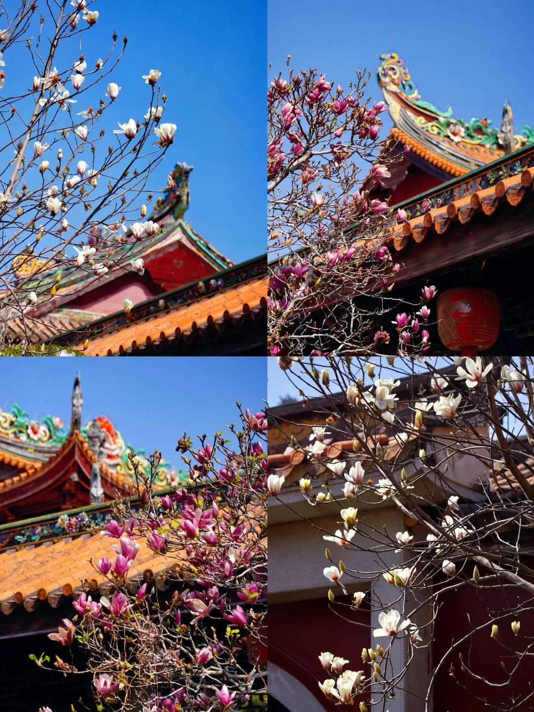 ②、开元寺红墙前,木兰花开了——白的像雪落枝头,红的似烛火点春风。红白相映,是春天写给古刹的对联。