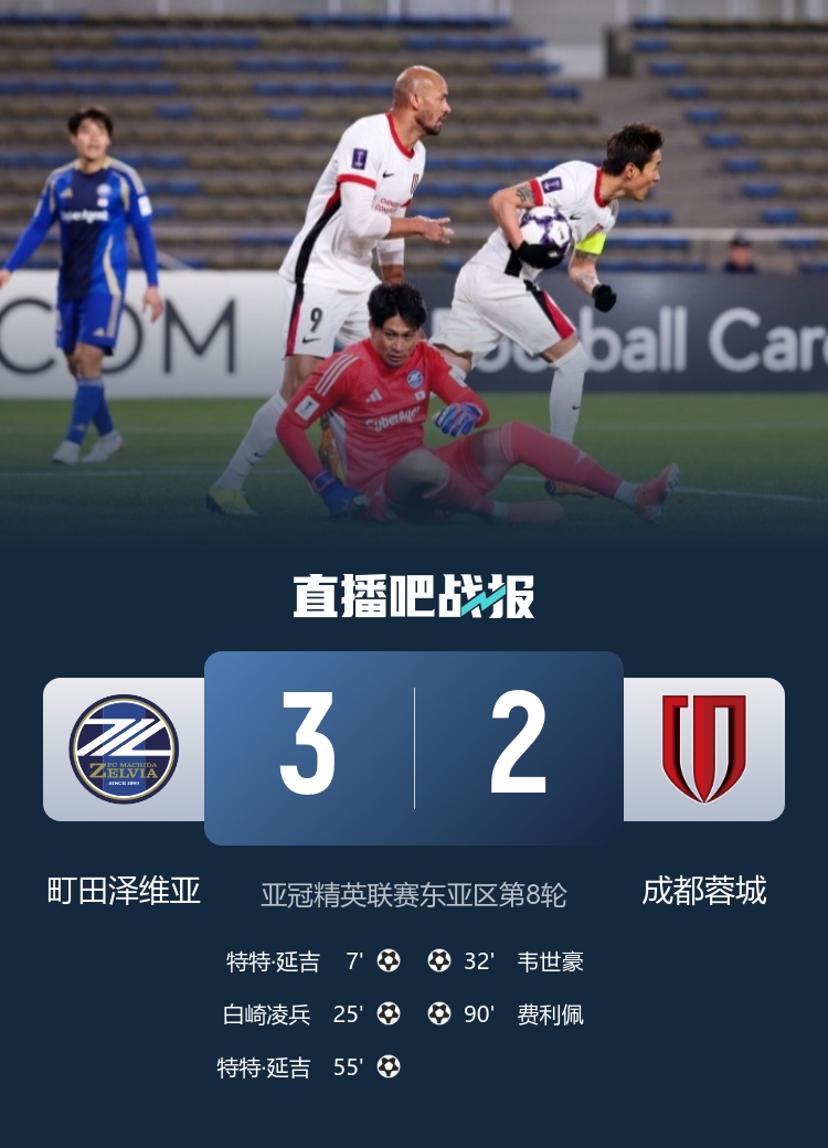 直播吧2月17日讯北京时间2月17日18点,亚冠精英联赛东亚区第8轮,成都蓉城做客町田市立陆上竞技场对阵町田泽维亚。上半场,延吉率先破门,白崎凌兵打进世界波,韦世豪利用守田达弥失误扳回一球。下半场,延吉射中立柱后头球再进一球,费利佩补时再扳一球。最终成都蓉城2-3不敌町田泽维亚。