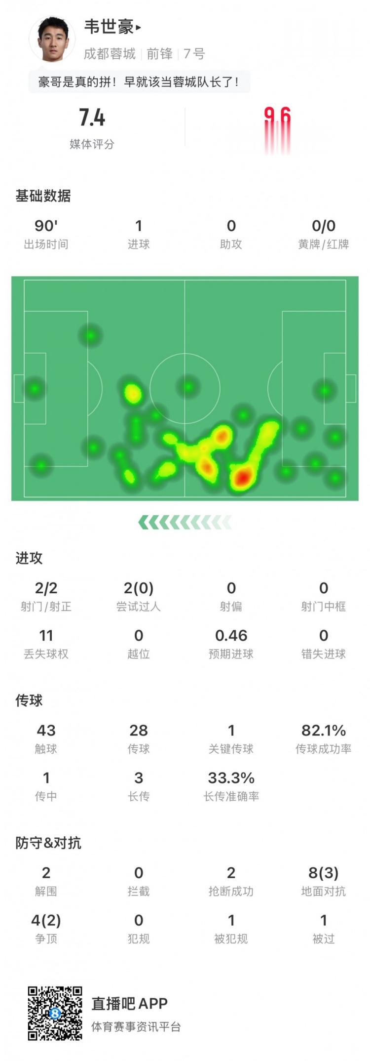 韦世豪全场数据如下