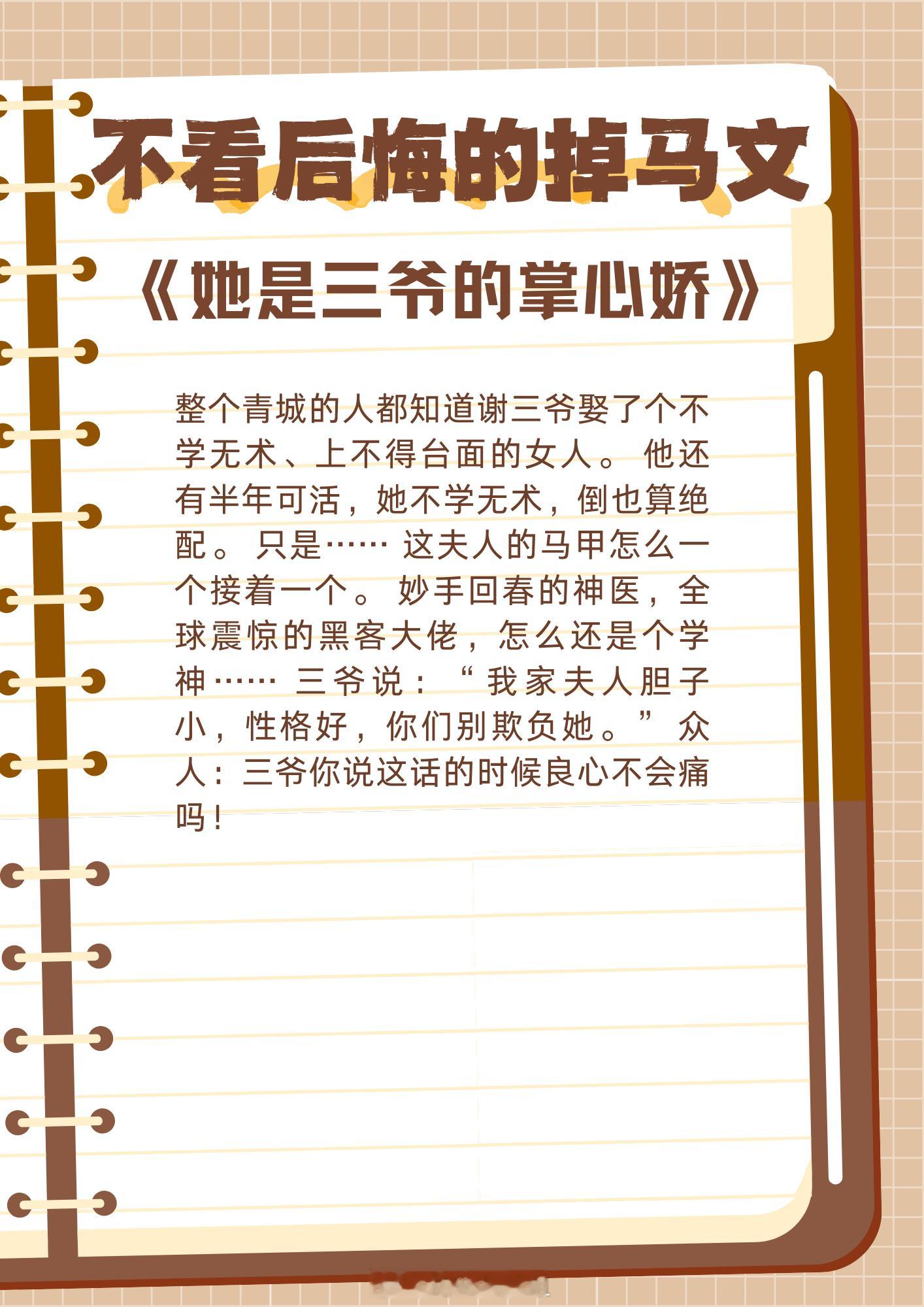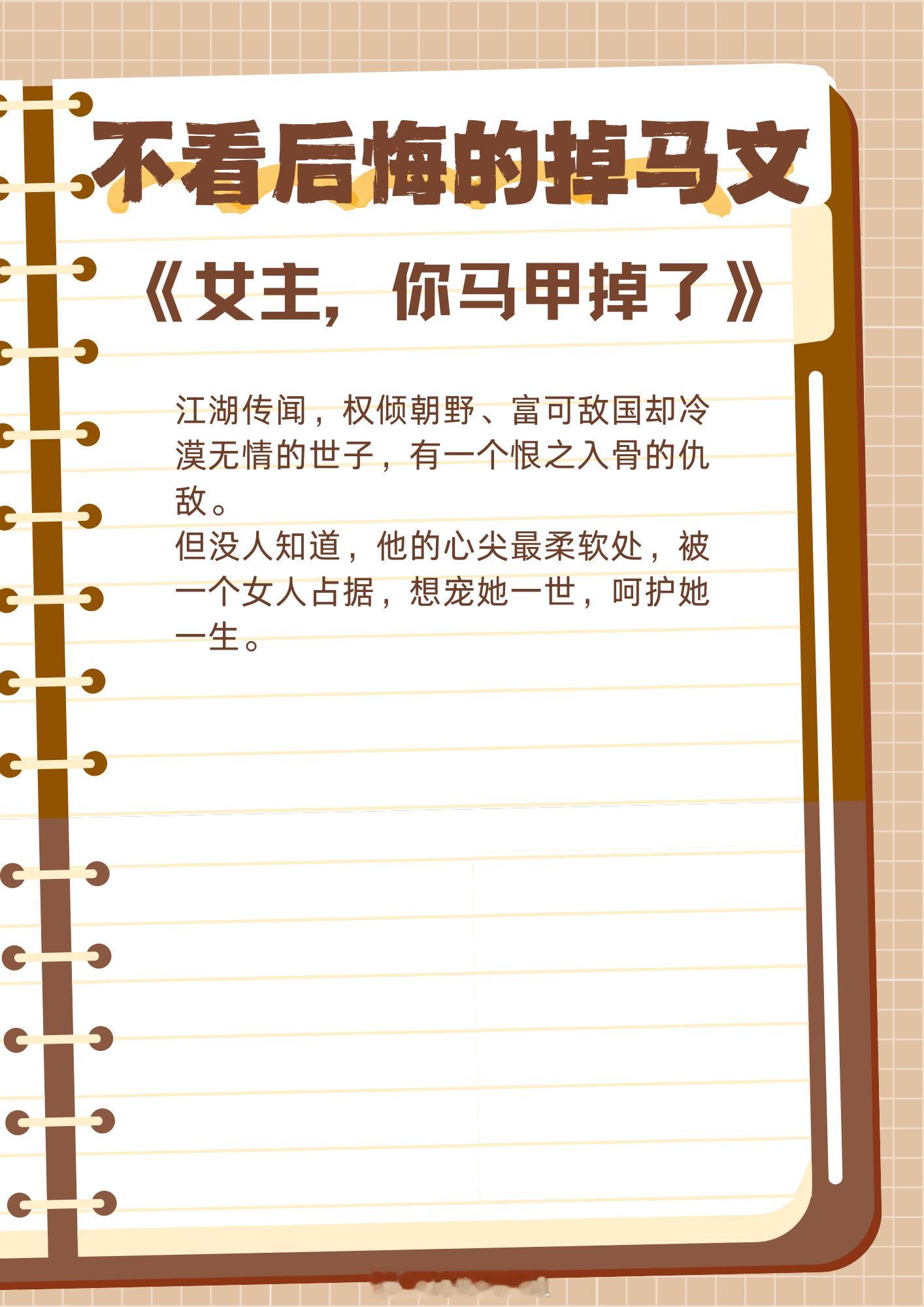不看后悔的掉马文,从别后,忆相逢,几回魂梦与君同。1、《探花》作者:卿隐2、《宠妃的演技大赏》作者:发达的泪腺3、《渡我》作者:曲小蛐4、《贵极人臣》作者:姽婳娘5、《女主,你马甲掉了》作者:神泣血泪6、《迟来童话》作者:十三涧7、《谁在说小爷的坏话?》作者:风歌且行8、《宫廷欢》作者:起跃9、《她是三爷的掌心娇》作者:卿浅浅这小说真的超绝 兜兜转转还是这些小说好看