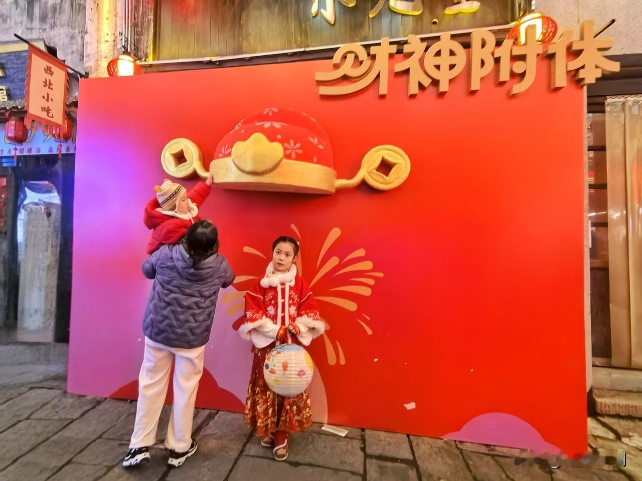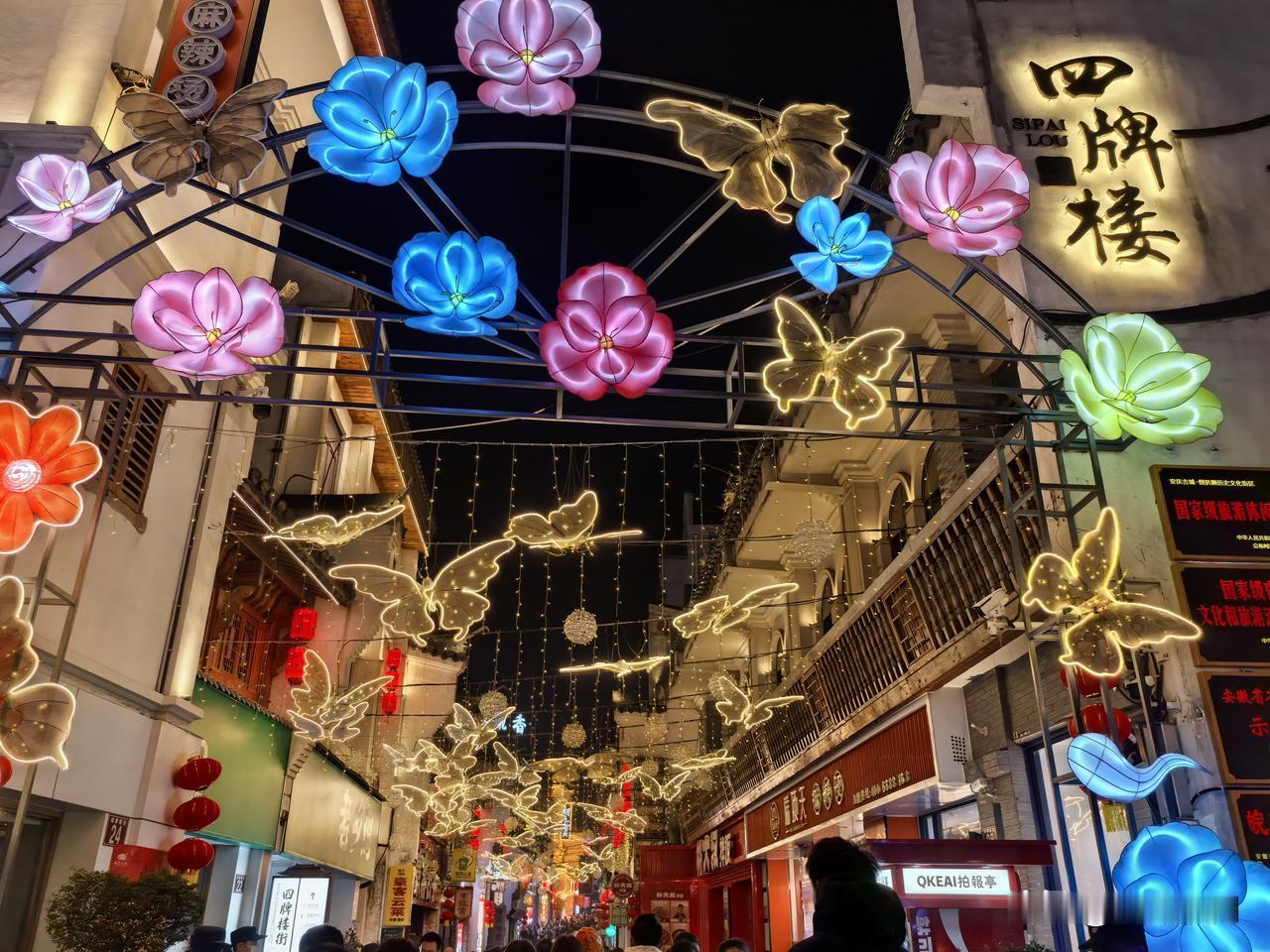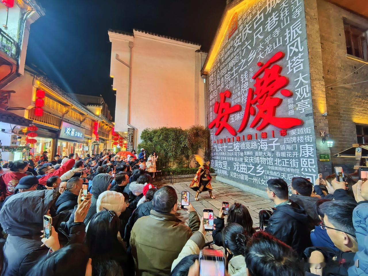 正月初一的倒扒狮,灯火璀璨,人潮涌动。古街在彩灯下焕发新颜,“安庆”二字醒目夺目,年味十足。人们在“财神附体”“今日宜发财”等打卡点拍照留念,孩童在怀旧场景中嬉戏。这里融合文化、娱乐与美食,以光影盛宴迎新年,尽显“安庆有戏”的独特魅力。安庆倒扒狮 皖美安庆