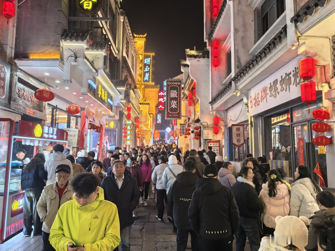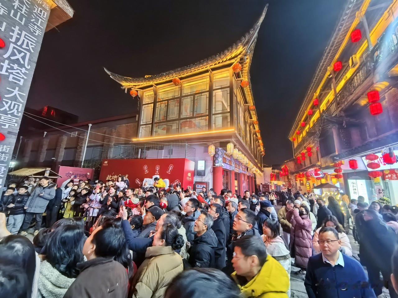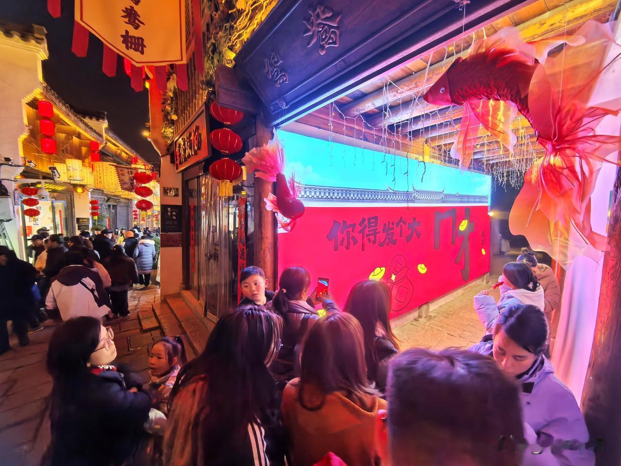 正月初一的倒扒狮,灯火璀璨,人潮涌动。古街在彩灯下焕发新颜,“安庆”二字醒目夺目,年味十足。人们在“财神附体”“今日宜发财”等打卡点拍照留念,孩童在怀旧场景中嬉戏。这里融合文化、娱乐与美食,以光影盛宴迎新年,尽显“安庆有戏”的独特魅力。安庆倒扒狮 皖美安庆