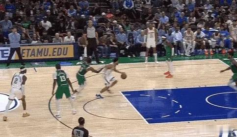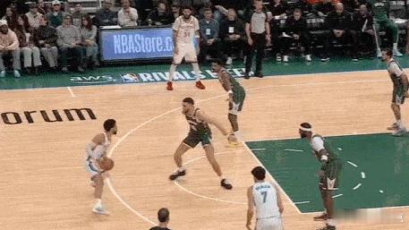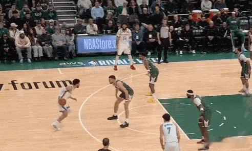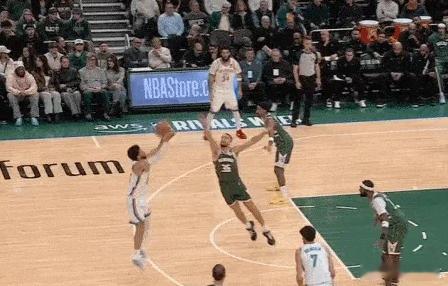 56789安杰伊米切尔弧顶持球小打大,惩罚南斯错位:行进至三分线后使用“胯下-体前衔接拜佛”的小连招,连续攻击防守人重心后立即出手横撤步三分,手起刀落。