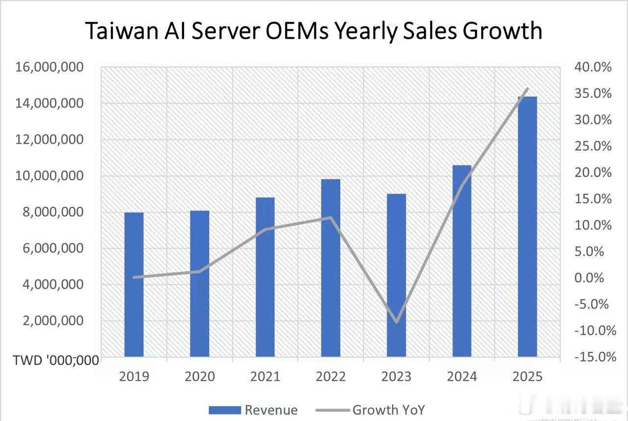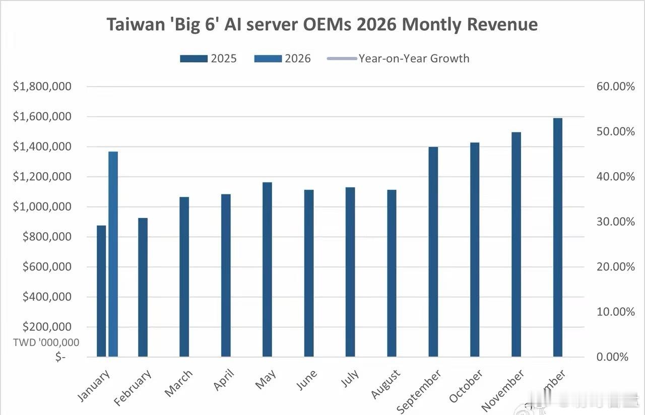 受英伟达GB300服务器出货量增长的推动,台湾六大AI服务器厂商1月份营收同比增长56%,达到1.37万亿新台币(约合436.5亿美元)。这是自去年2月以来最强劲的月度增长,超过了12月份的54.1%。为了更好地理解一月份的情况,X 在这张图表中标记了位置:去年市场份额高达40%的全球最大人工智能服务器制造商富士康表示,强劲的需求推动了1月份的营收增长,并且这一趋势还将持续。富士康董事长刘洋将2026年的营收目标设定为超过9万亿新台币(约合2870亿美元),创历史新高。去年,台湾六大科技巨头均创下营收新高,增长幅度惊人。例如,人工智能服务器专家维颖的营收从2024年的3605亿新台币增长近三倍,达到9507亿新台币。台湾六大科技公司1月份营收:富士康 7300亿新台币,同比增长36%广达 2308亿新台币,同比增长62%纬创 2284亿新台币,同比增长152%维颖 832亿新台币,同比增长122%英业达 618亿新台币,同比增长35%技嘉 331亿新台币,同比增长57%六大公司中的五家在向台湾证券交易所提交的声明中强调了“持续的人工智能热潮”在“强劲的客户需求”下推动了人工智能服务器的销售。今年开局强劲,各公司预计这一趋势还将继续上升。