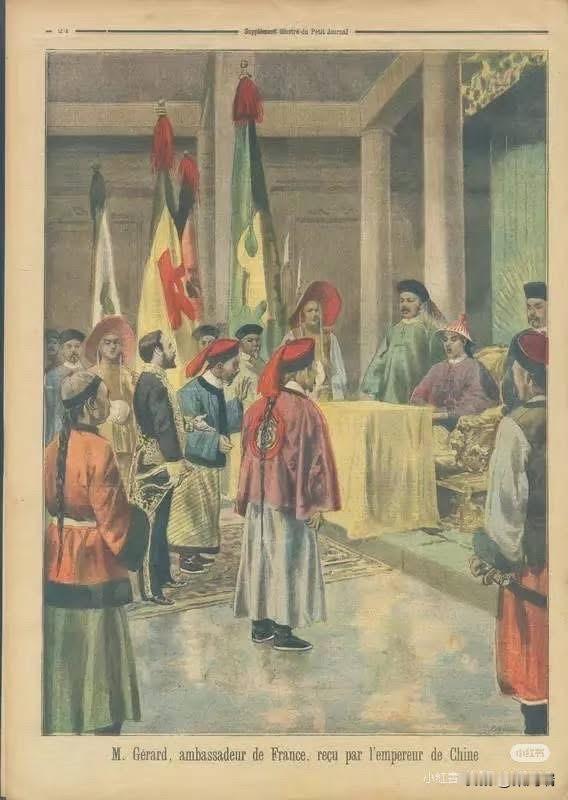 这是法国艺术家福蒂内·梅奥尔(Fortuné Louis Méaulle)创作的一幅版画,版画描绘了1895年法国驻华公使奥古斯特·热拉尔(Auguste Gérard)在北京觐见清朝光绪皇帝的历史场景。 这幅彩色版画,最初作为法国报纸《小刊物》(Le Petit Journal)插页出版于1895年1月20日。 历史意义:热拉尔于1893年至1897年间担任法国驻华公使。此次会面标志着当时中法两国之间重要的外交接触。 画面主要人物: 光绪皇帝:坐在画面右侧的宝座上,正在接见外国使节。 热拉尔公使:站在左侧,身着19世纪法式外交礼服。 场景细节: 背景中可以看到清朝廷的官员、侍卫以及象征皇权的旗帜和装饰。 图片下方法文说明为:“M. Gérard, ambassadeur de France, reçu par l'Empereur de Chine”(法国公使热拉尔先生受到中国皇帝接见)。 这份外交记录反映了甲午战争(1894-1895年)前后,清政府在外交压力下逐步调整与西方列强外交礼仪的历史进程。