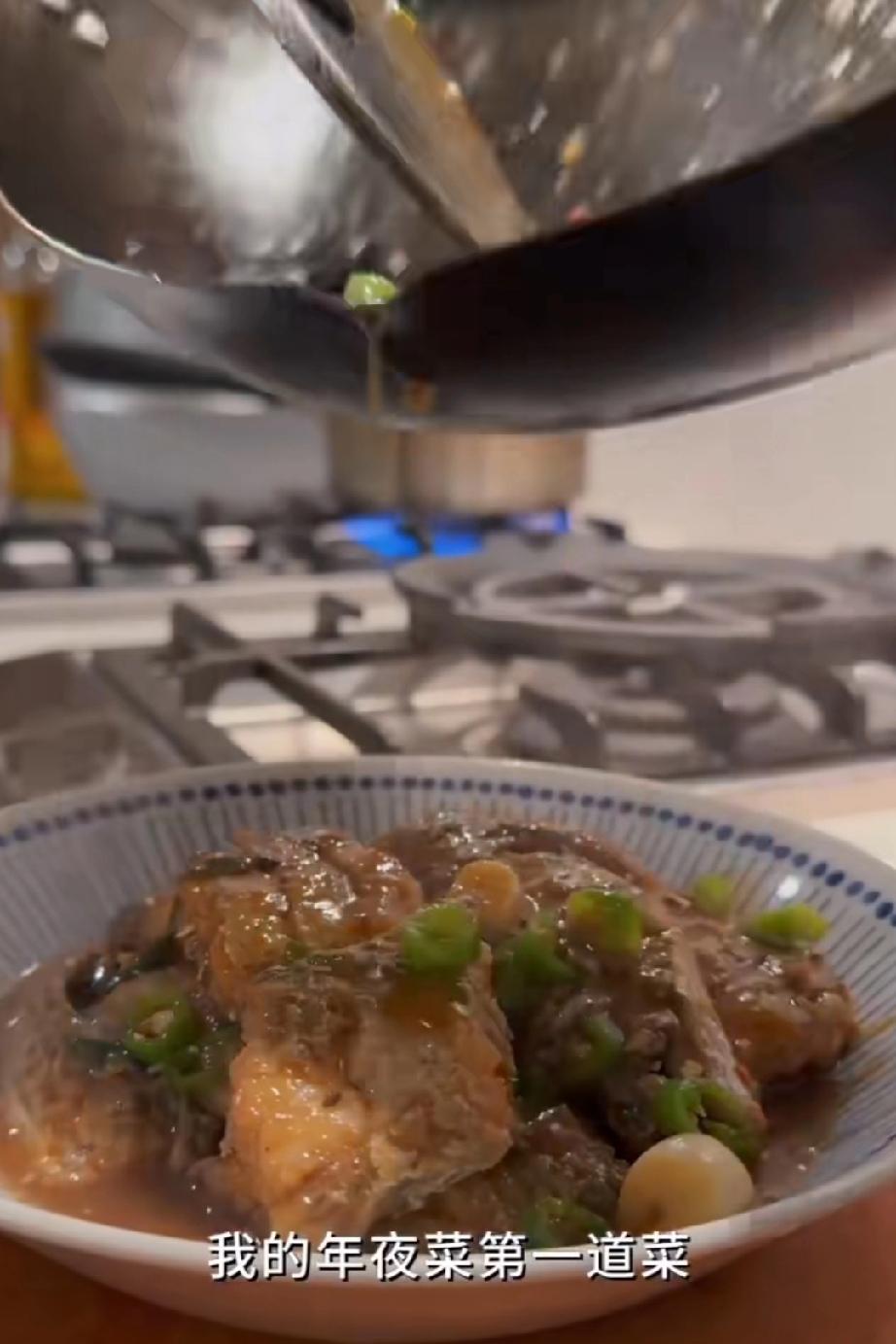 快到春节了,董洁为儿子顶顶做了两道拿手好菜,一个是红烧带鱼,一个是酸辣牛肉汤。董