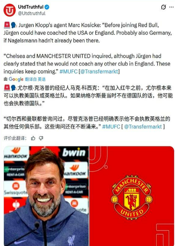 刚歇了不到一年,克洛普的经纪人就把曼联和切尔西全给得罪了。 经纪人公开讲,克洛普离开利物浦后,曼联和切尔西的电话就没断过。话音刚落,两家俱乐部直接站出来辟谣,说根本没这回事,从未接触过。 这经纪人还把美国、英格兰、德国国家队都抬了出来,说都想抢克洛普。结果呢?人家转身去了红牛集团当足球总监,根本不回教练席。 克洛普对利物浦的感情是真的,但经纪人的嘴,又有几句是真的?